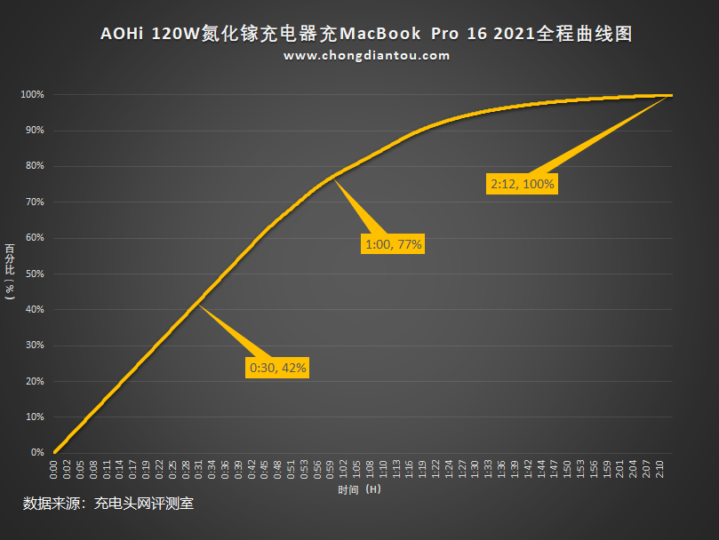 将充电全程绘制成曲线图,可以看出半小时充电42%,1小时充电77%,完全充满需要2小时12分。