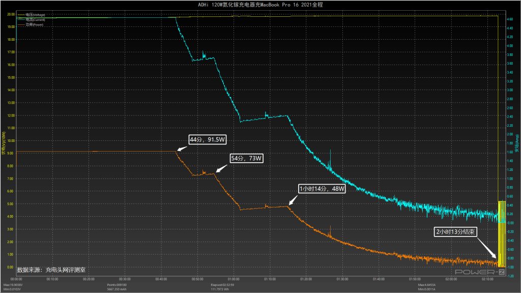 这是使用充电器的USB-C为MacBook Pro 16 2021充电全程的数据变化情况,全程共分为四个阶段,于2小时13分充电结束,最高功率为19.74V 4.63A 91.58W。