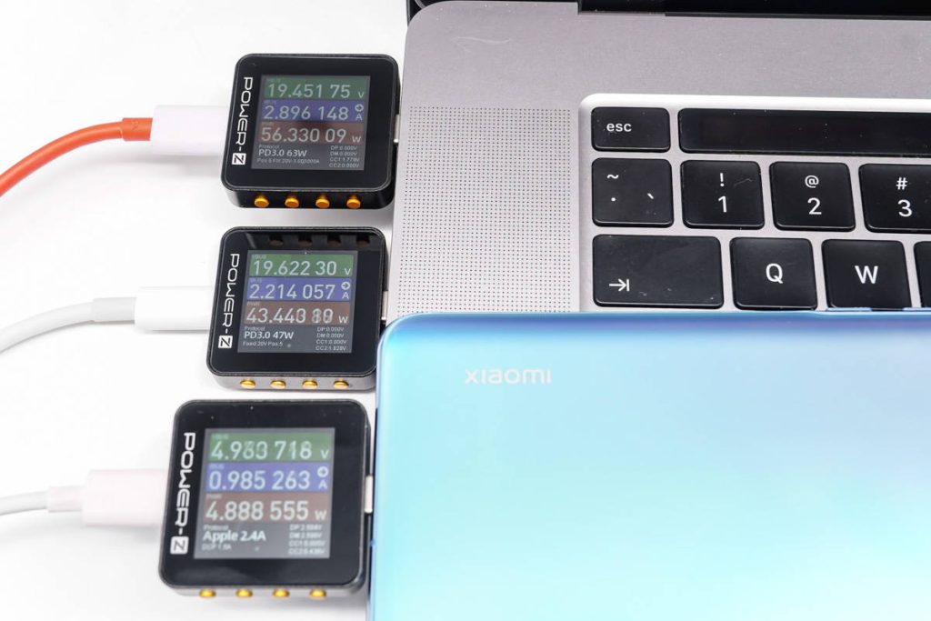 使用两个 USB-C 接口和一个 USB-A 接口同时为 MacBook Pro 16 2021、MacBook Pro 16 和小米11充电,充电功率分别为56.33W、43.44W和4.88W,合计功率104.65W。