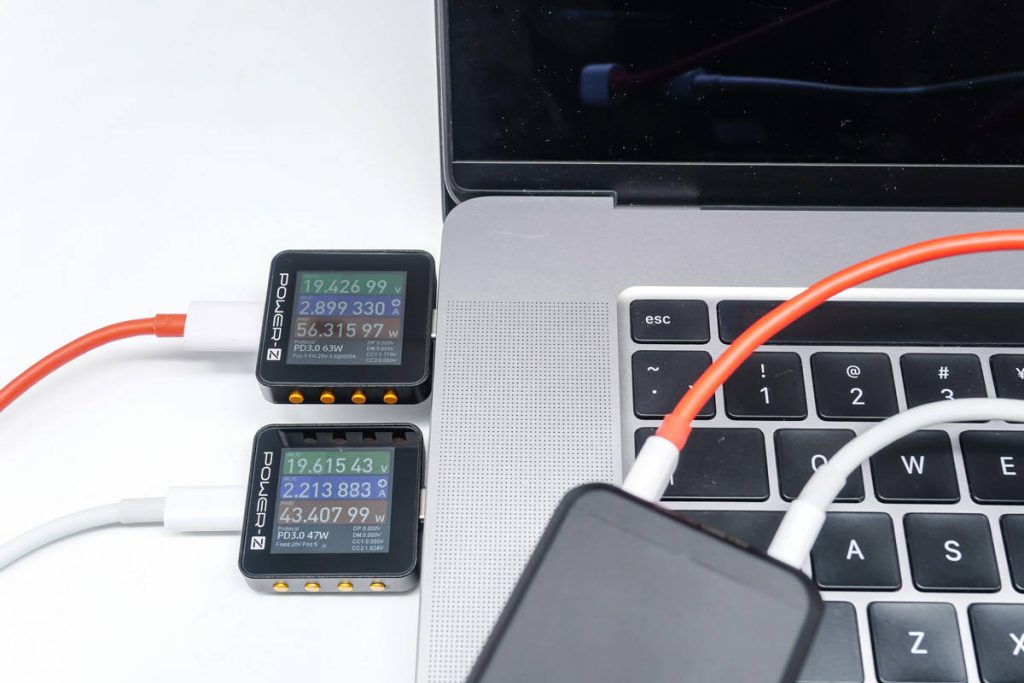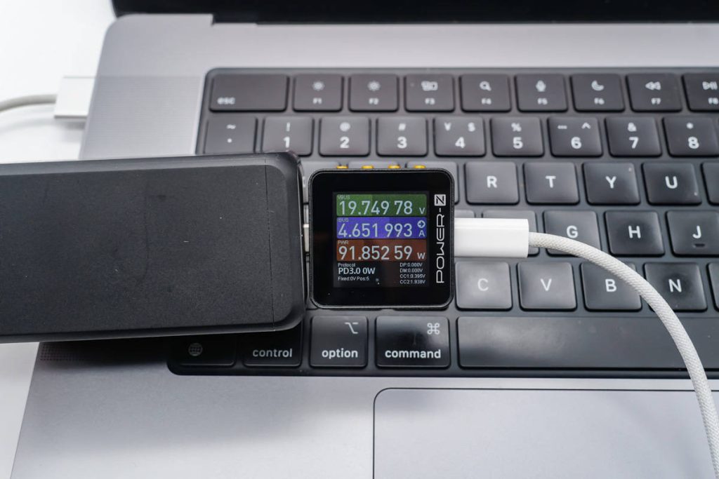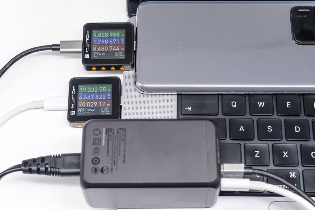 使用 USB-C 和 USB-A 接口同时为 MacBook Pro 16 2021 和三星S20 Ultra 充电,功率分别为90.02W和8.68W,合计功率98.7W。