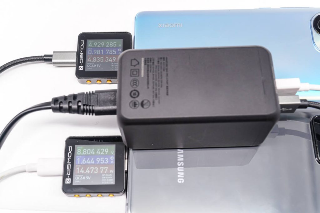 使用两个 USB-A 接口同时为三星S20 Ultra 和小米11充电,充电功率分别为14.47W和4.83W,合计功率19.3W。