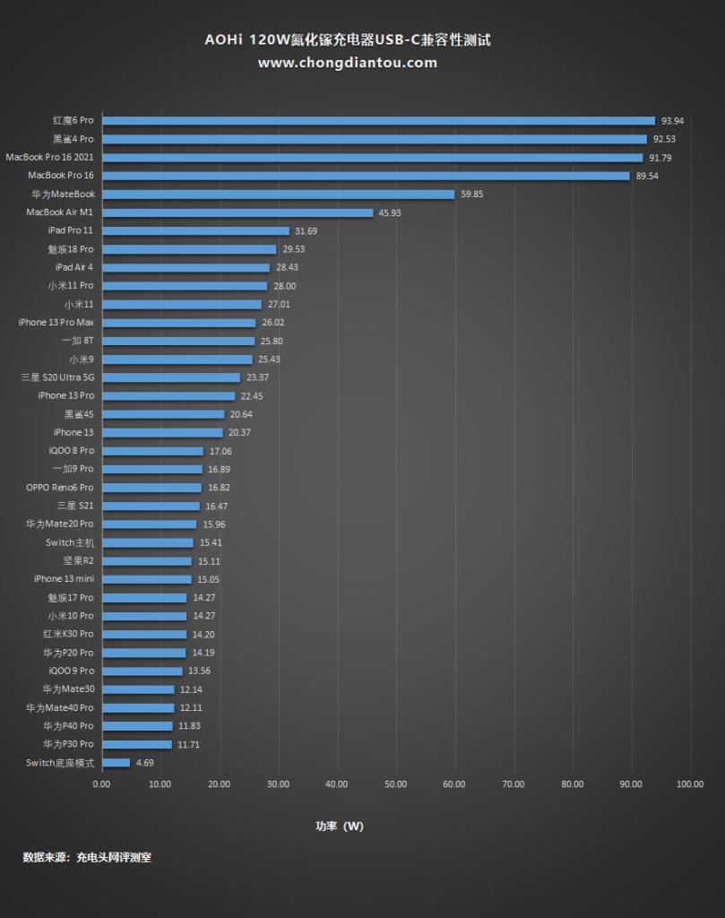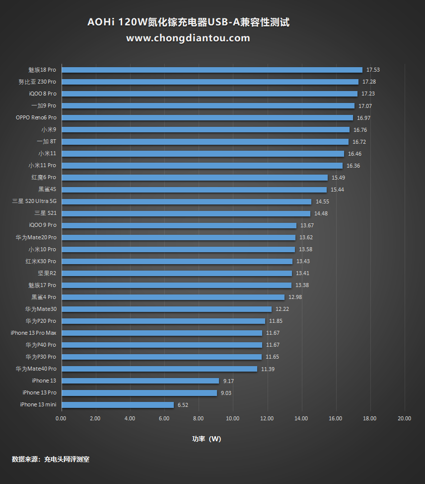 将充电功率从高到低排序,制成柱状图方便大家直观的比较不同设备间充电功率的差别。
