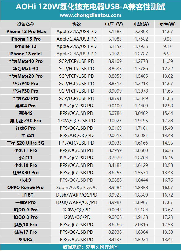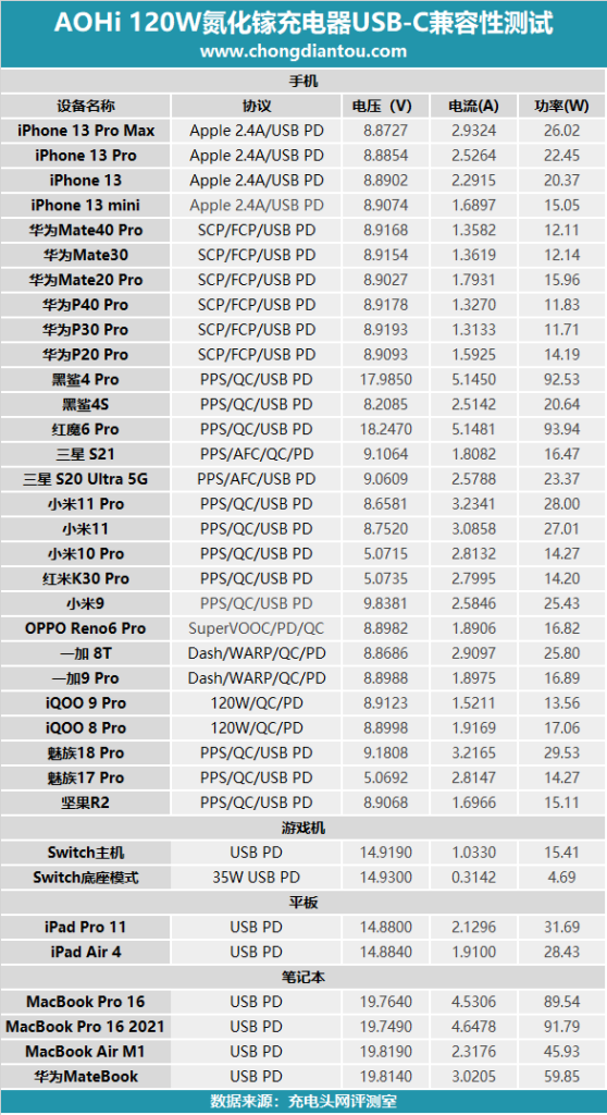 兼容性测试环节可以清楚的得知充电器为各个设备的充电情况,充电头网会使用数十款设备搭配充电器进行测试,为读者呈现真实的测试数据。