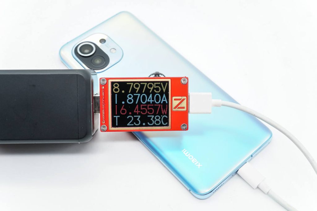 使用 USB-A 接口为小米11充电,功率约为 8.79V 1.87A 16.45W。