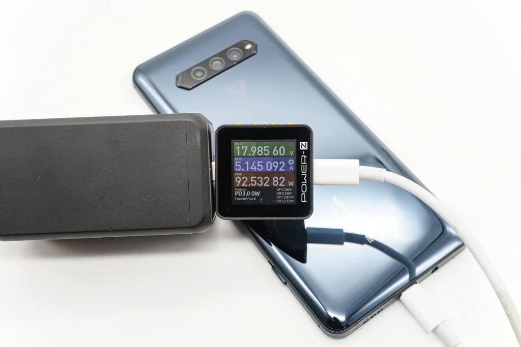 使用 USB-C 接口为黑鲨4 Pro 充电,功率约为 17.98V 5.14A 92.53W。