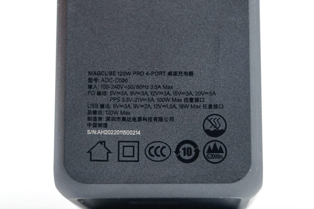 充电器的底部则印有参数,型号为 AOC-C006,支持宽频电压输入,两个 USB-C 接口支持盲插,最高功率100W,并兼容 3.3-21V5A 的PPS档位,USB-A 则最大支持18W功率,在多口使用时最大合计输出120W。