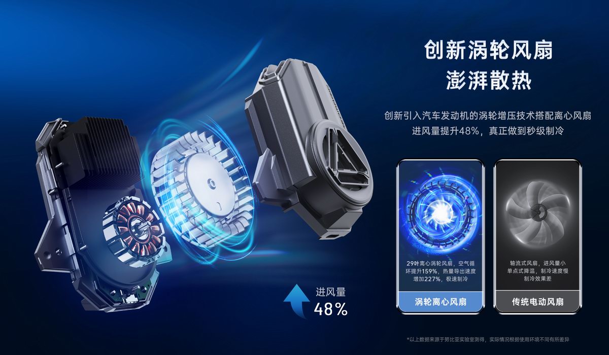 从官方提供的拆解图来看,红魔涡轮散热背夹内部带有电子制冷片,制冷片覆盖散热片鳍片设置在上部分,下部分是29片扇叶的涡轮离心风扇,这种涡轮散热结构与NVIDIA公版涡轮显卡类似,相比传统散热器进风量提升48%,热量导出速度增加227%。