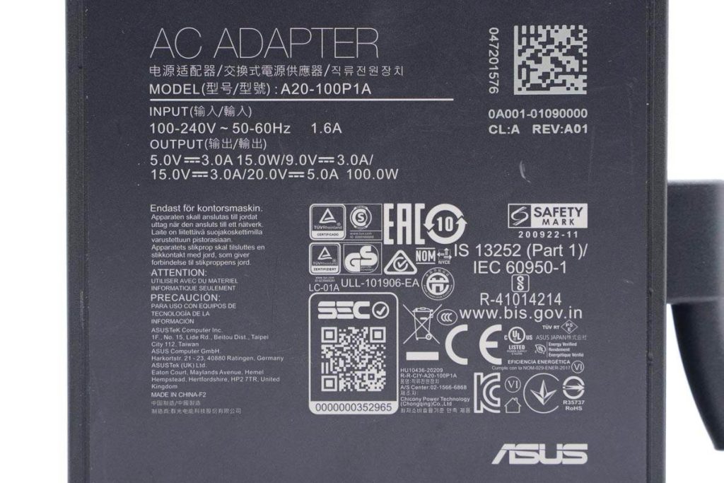 这款充电器的型号为 A20-100P1A,支持宽频电压输入,输出部分则最高100W。