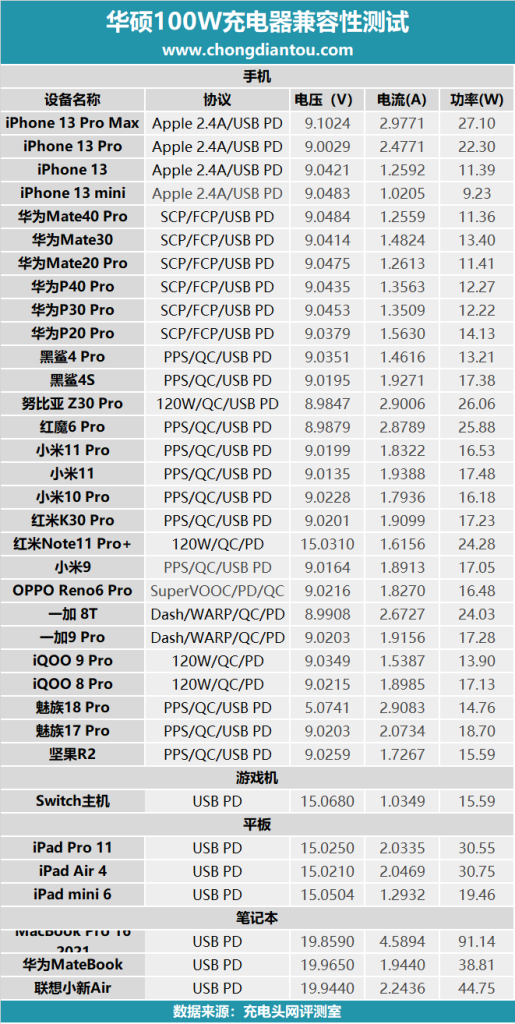 兼容性测试环节可以清楚的得知充电器为各个设备的充电情况,充电头网会使用数十款设备搭配充电器进行测试,为读者呈现真实的测试数据。