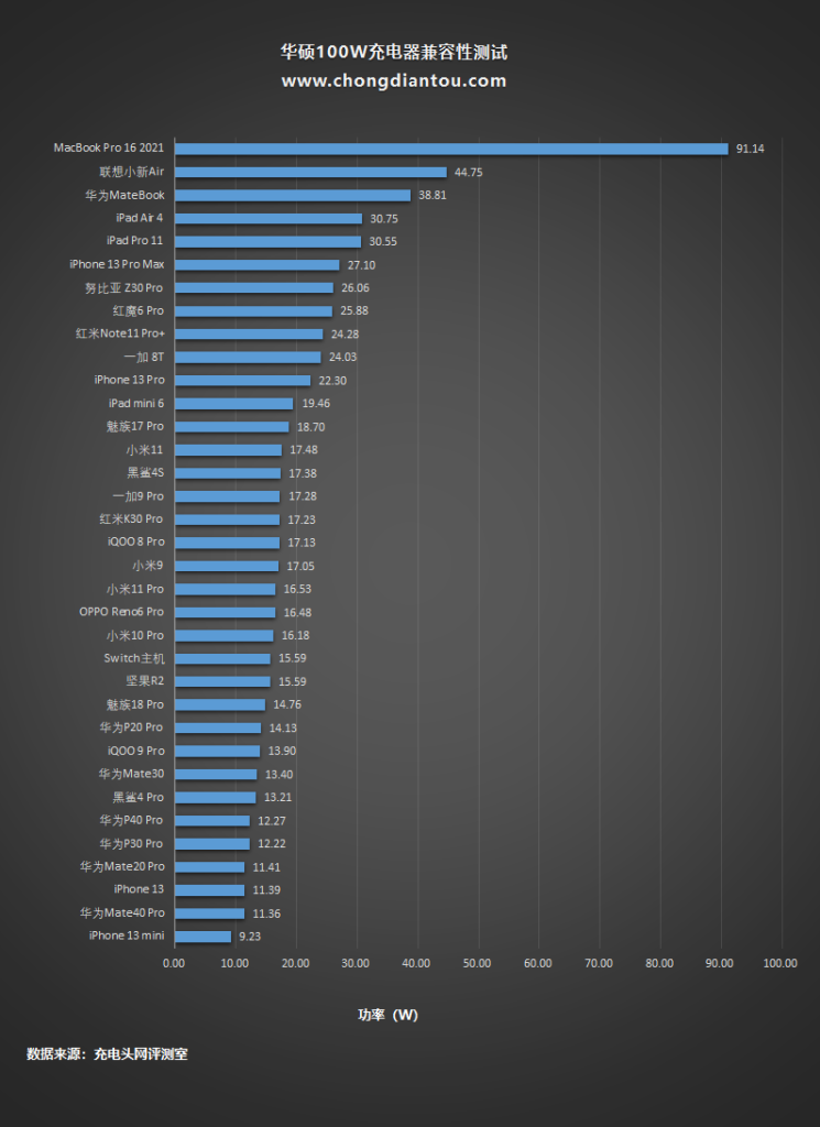 将充电功率从高到低排序,制成柱状图方便大家直观的比较不同设备间充电功率的差别。