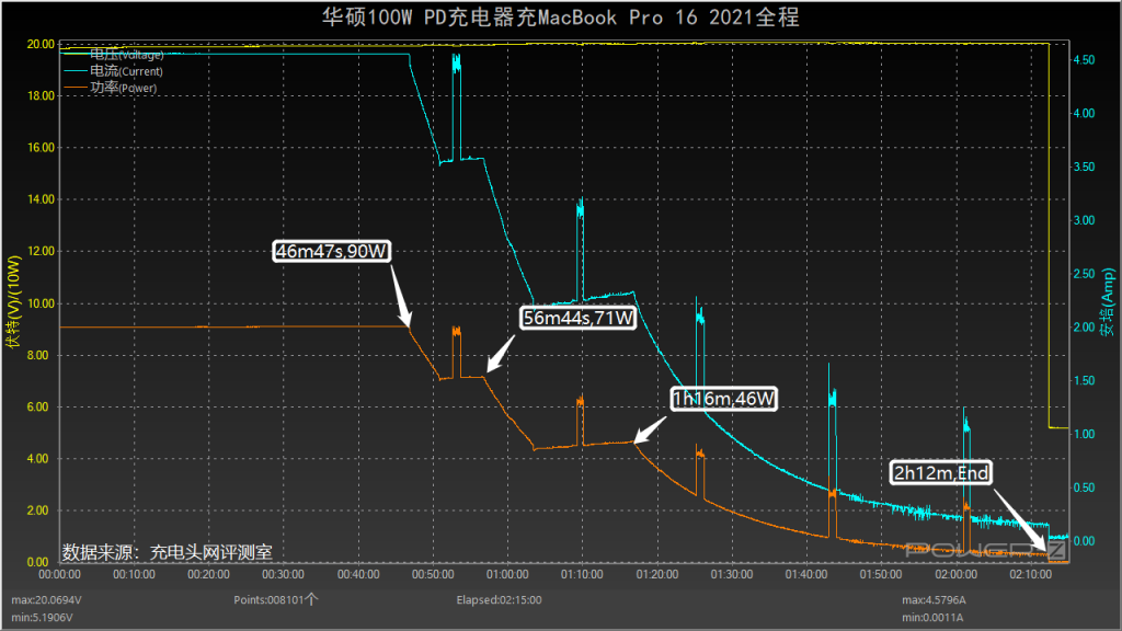 这是使用华硕100W PD充电器充MacBook Pro 16 2021全程的数据,整个过程共分为四个阶段,于2小时12分结束。