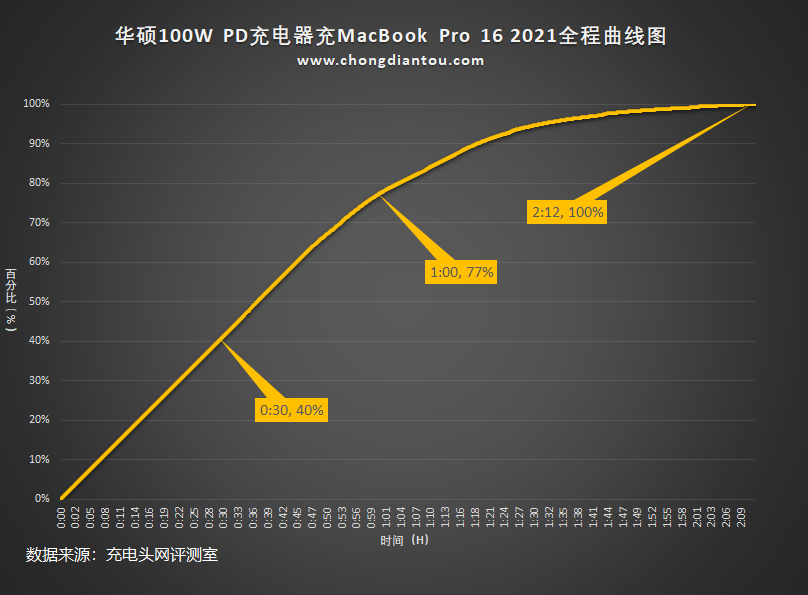 将充电全程绘制成曲线图,可以看到半小时充电40%,1小时充电77%,完全充满需要2小时12分。
