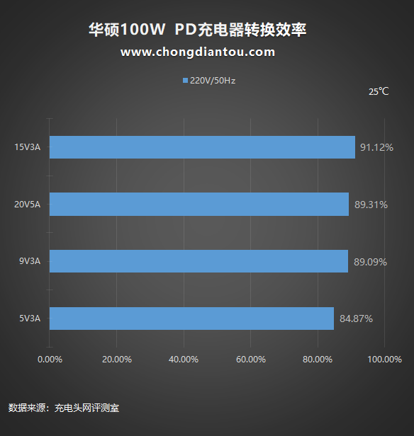 充电器本质上是一种转换设备,过程中会有损耗,以热量的形式散发出来。我们平时看充电器上面的参数输出100W或者65W是充电器可以为设备提供的最大输出功率,但充电器从插座上汲取的功率往往要更大一些,下面是充电器在220V 50Hz和110V 60Hz交流输入的情况下分别进行了转换效率测试,测试结果如下: