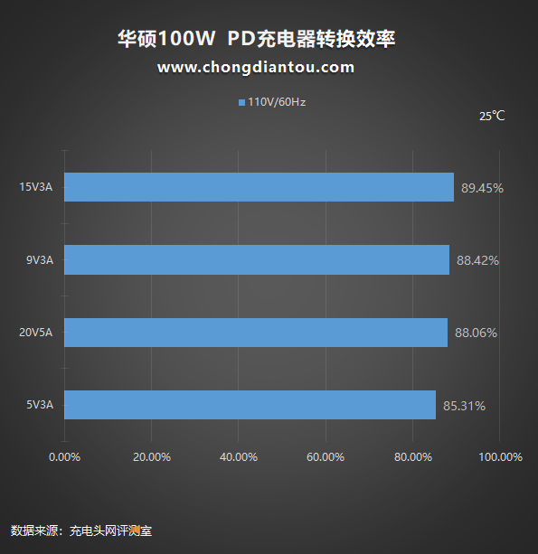 110V 60Hz下,充电器的转换效率从85.31%到89.45%不等。