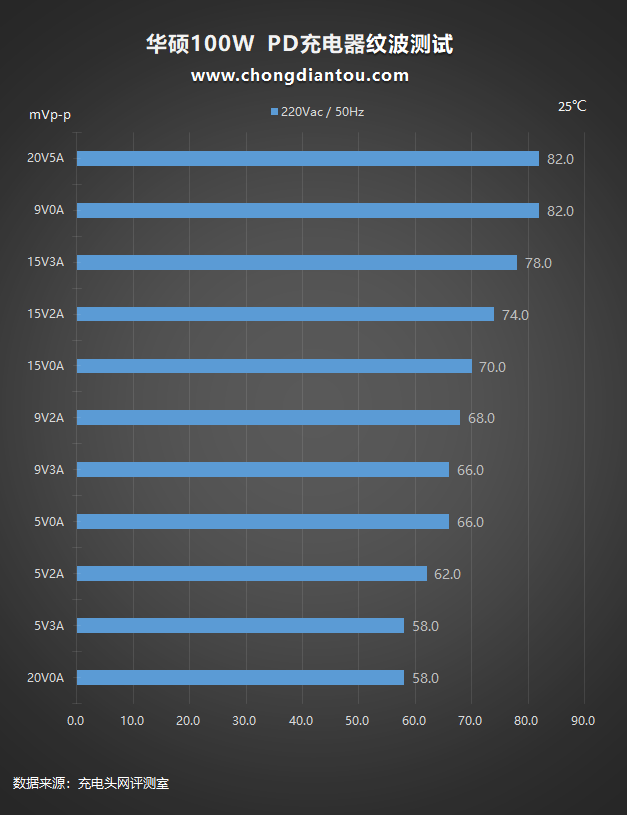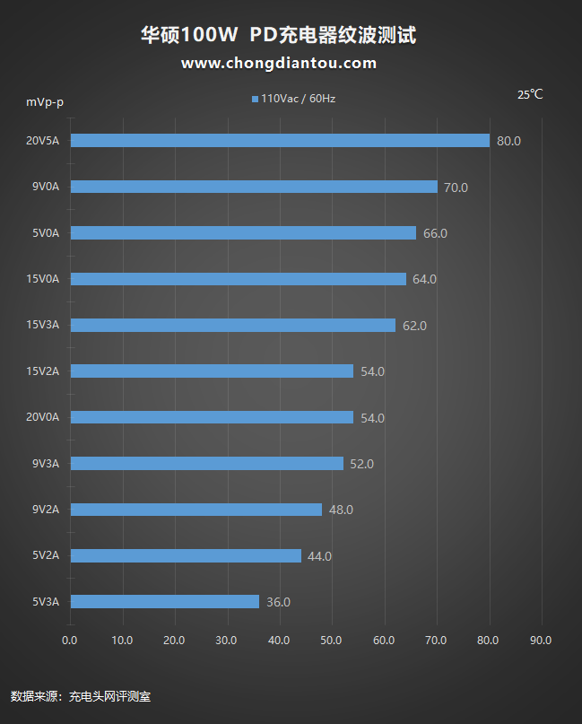 110V 60Hz下,最高为80mVp-p,充电器处于20V5A输出状态;最低为36mVp-p,充电器处于5V3A输出状态。