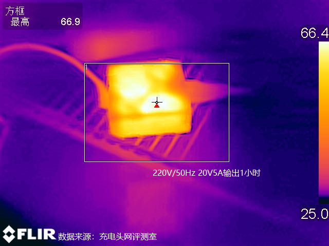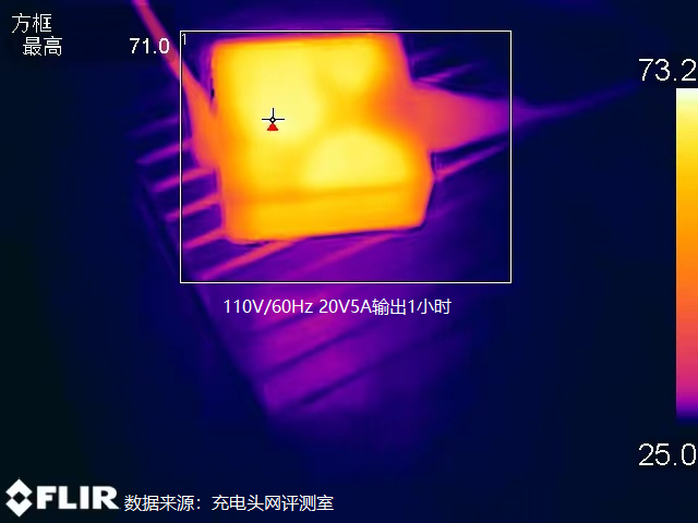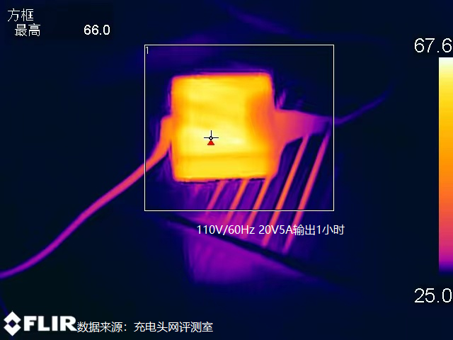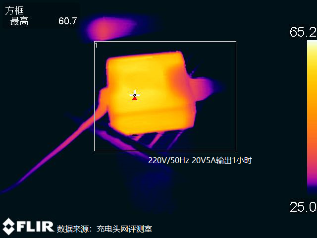 前面提到充电器工作时会涉及到效率转换的问题,其中的损耗电量绝大多数以热量散发,所以充电器长时间工作的发热情况也是测试的重要一环。让充电器以100W功率持续输出一小时,采集充电器表面温度,实验全程将充电器置于25°C恒温箱当中。