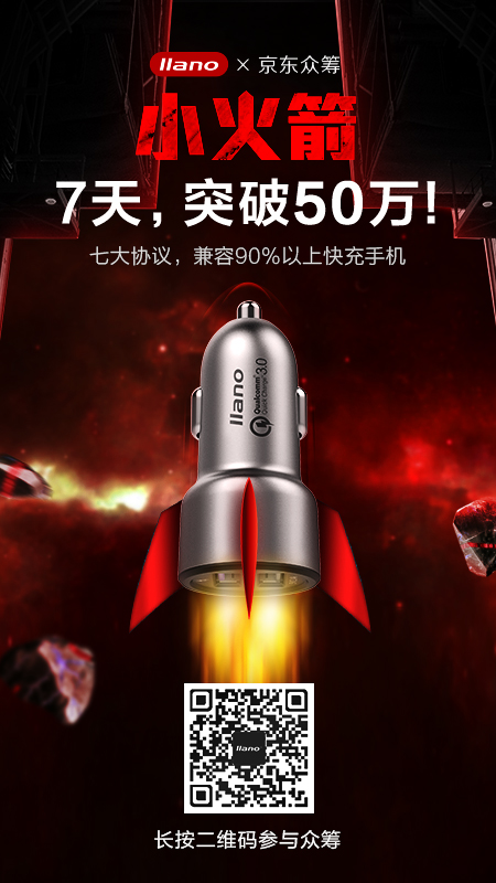 这款绿巨能小火箭快充车充上线京东众筹一周不到就获得5000人的支持,众筹金额超50万! 众筹地址及详细介绍:绿巨能 小火箭急速车载快充 微信推广 相关阅读: