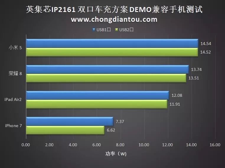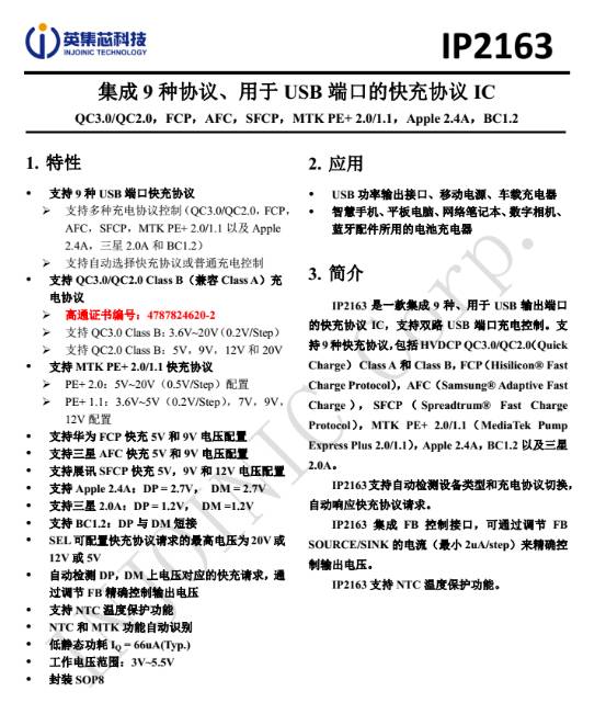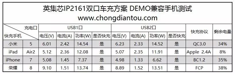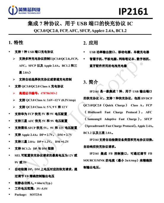 英集芯作为业界知名的电源芯片厂商,此前我们看到的大多是移动电源芯片,这次英集芯为大家带来一系列多面手独立快充协议芯片IP2161、IP2163,两个型号均支持多种快充协议,包括高通QC3.0/2.0、华为FCP、三星AFC、展讯SFCP、苹果2.4A和BC1.2协议等。其中两者最大的区别在于,IP2161采用sot23-6封装,不支持MTK PE+2.0/1.1快充协议;IP2163采用SOP8封装,支持MTK PE+2.0/1.1快充协议。 一、产品介绍 英集芯IP2161实拍图,图中sot23-6封装芯片 英集芯IP2163实拍图,图中SOP8芯片 英集芯IP2163支持QC3.0/2.0A/B输出,支持20V输出,同时可由外部引脚编程输出模式。MTK PE+支持以0.5V步进的5-20V输出(PE+2.0)或以0.2V步进的3.6-5V输出以及7,9,12V的固定电压输出(PE+1.1)。支持华为FCP 5V或9V输出。支持三星AFC  5V或9V输出。支持展讯SFCP  5V或9V或12V输出。 英集芯IP2161通过美国高通QC3.0认证,证书编号478786303-2 英集芯IP2163通过美国高通QC3.0认证,证书编号4787824620-2 英集芯IP2161、IP2163具有超低的工作功耗,标称静态工作电流66uA。DM、DP引脚支持耐压保护,即使数据线内部短路,也不会损坏充电器。可通过SEL脚设定输出电压范围为5V、5-12V和5-20V。 二、兼容性测试 从测试中可以看出,这款搭载英集芯IP2161快充协议芯片的双口车充DEMO板的输出性能非常强悍,两个USB口皆支持快充输出,兼容QC3.0/2.0、FCP、Apple 2.4A等协议。 以下是英集芯IP2161双口车充方案DEMO板兼容性详细测试。测试条件:手机看机息屏;测试工具:POWER-Z。 USB1口输出,给小米5充电,手机剩余电量34%,6.01V/2.43A,约14.6W,握手QC3.0。 USB2口输出,给小米5充电,6.23V/2.33A,约14.53W,握手QC3.0。 USB1口输出,给荣耀8充电,手机剩余电量38%,9.10V/1.51A,约13.76W,支持FCP。 USB2口输出,给荣耀8充电,8.89V/1.52A,约13.55W,支持FCP。 USB1口输出,给iPad Air2充电,剩余电量8%,5.12V/2.36A,约12.1W全速充电。 USB2口输出,给iPad Air2充电,5.07V/2.35A,约11.9W全速充电。 USB1口输出,给iPone 7充电,手机剩余电量35%,5.08V/1.43A,约7.4W快速充电。 USB2口输出,给iPhone 7充电,4.98V/1.26A  约6.6W快速充电。 三、购买联系 英集芯IP2161、IP2163可用于充电器、移动电源、车充、USB插线板、多口充电器等。目前该芯片已经批量出货,有需要的客户可以跟英集芯原厂代理取得联系。   相关阅读: