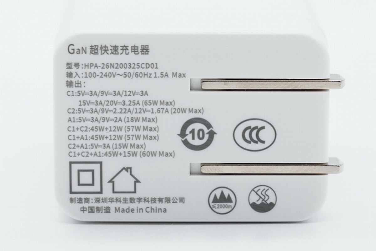 这次介绍的华科生 65W 氮化镓充电器是华科生 65W 2C1A 氮化镓快充新品系列中的其中一款,它采用条形柱状设计,功率密度 0.82W/cm³,体积仍然保持小巧便携高密度,100-240V 50/60Hz 全球电压搭配折叠插脚,适用于不同地区客户使用。