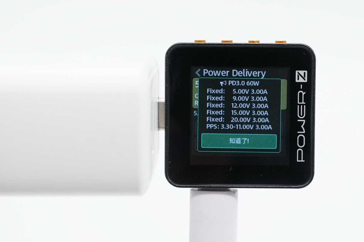 通过 POWER-Z USB 测试仪读取接口报文发现,USB-C 接口基于 PD3.0 版本开发,支持 5V3A / 9V3A / 12V3A / 15V3A / 20V3A 五个固定电压输出档,另外还带有 3.3-11V3A 一组 PPS 电压子集。
