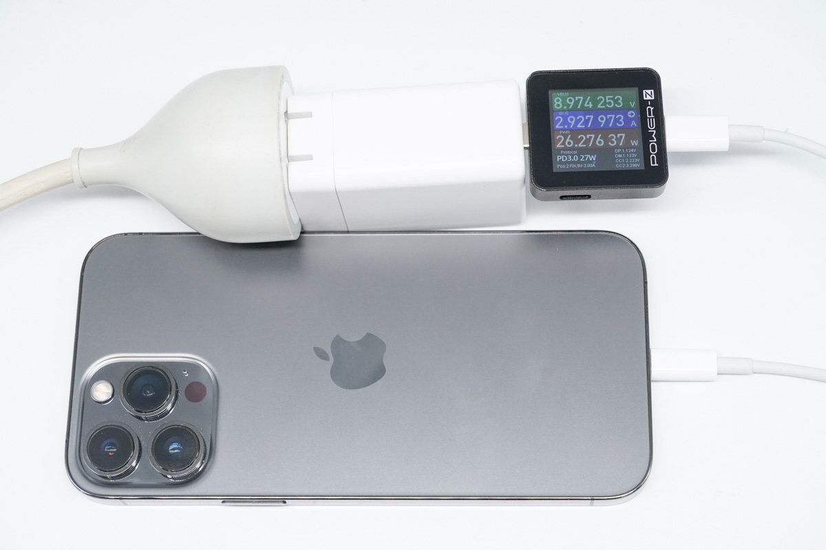 实测对 iPhone 13 Pro Max 充电,充电瞬间握手 9V PDO,功率 8.97V 2.92A 26.27W,达到设备快充功率最大值。