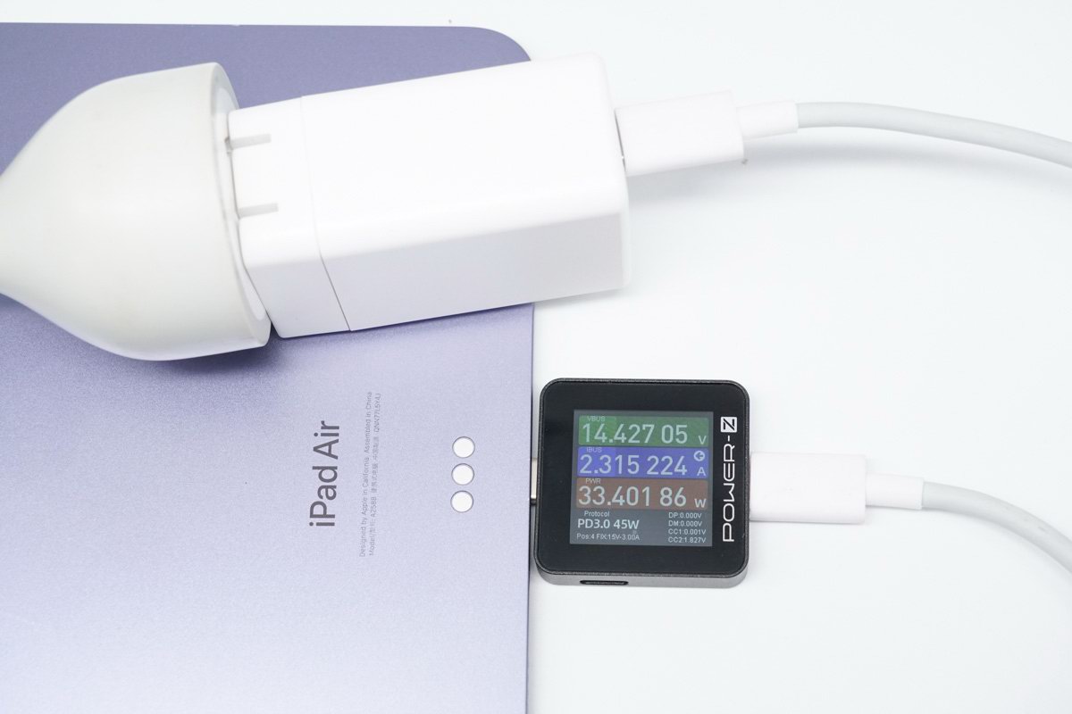 对 iPad Air 5 充电,充电瞬间握手 15V PDO,功率 14.42V 2.31A 33.4W,达到设备快充功率最大值。
