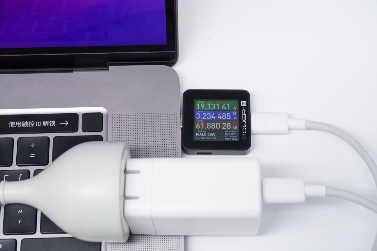实测对 Macbook Pro 16 充电,充电瞬间握手 20V PDO,功率 19.13V 3.23A 61.88,达到充电器输出功率最大值。
