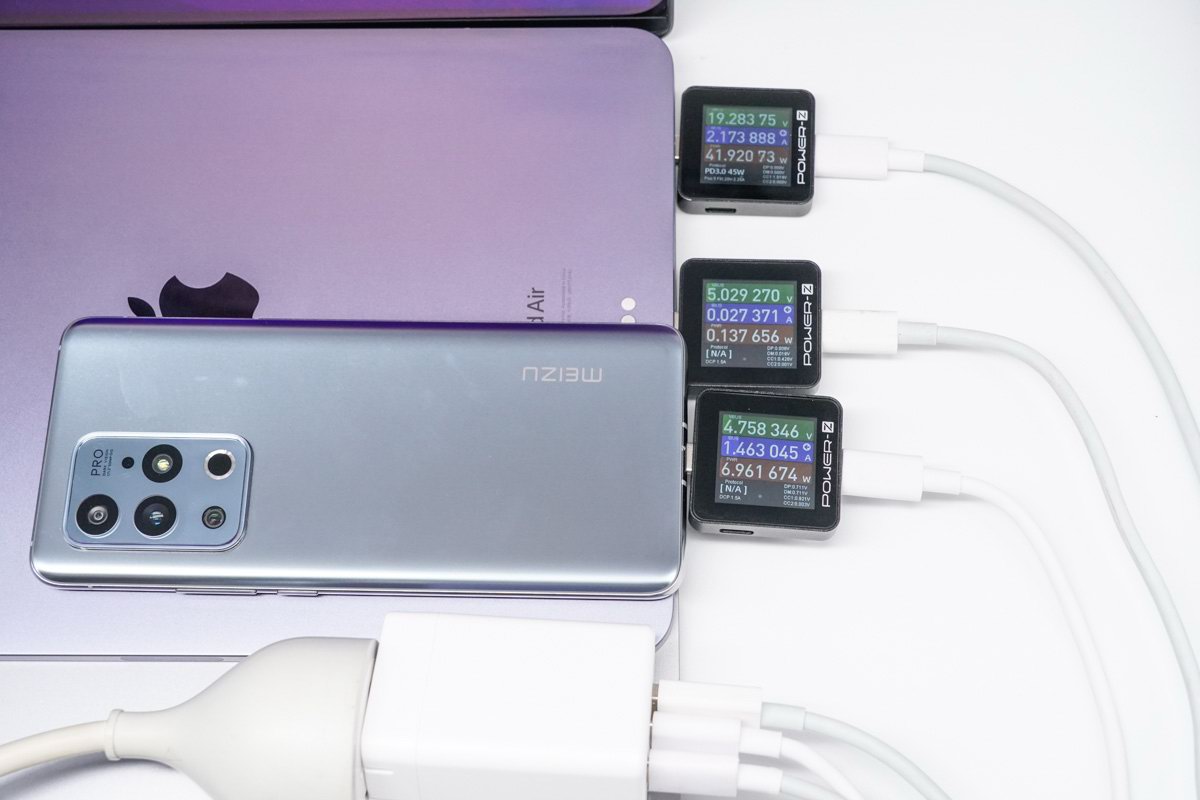 性能方面,2C1A 接口单独使用时功率分别为 65W + 20W + 18W,三口全部一起充电时 USB-C1 为主力快充接口可提供 45W PD 快充,C2/A 为共享一路 5V 设计,是经典的三口双路大小功率方案。