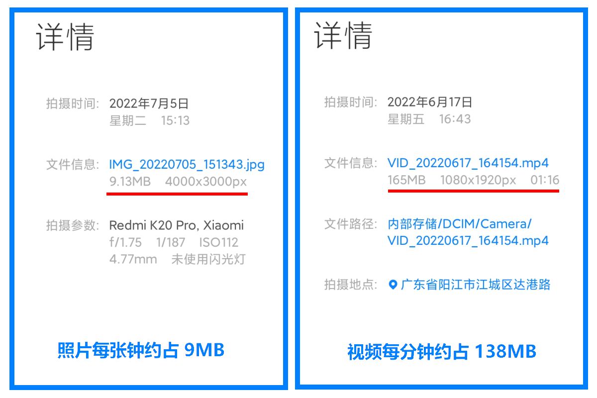 提取日常拍摄的视频与照片看看有多大空间,其中,1 分钟 1080p 分辨率的视频占用大约为 138MB 空间,而一张照片大约占用 9MB 空间。对于带娃党来说,每天拍个几十张照片几分钟视频是很正常的事情,按照 50 张照片 + 5 分钟视频计算,每天产生的拍娃素材就多达 1GB 以上。