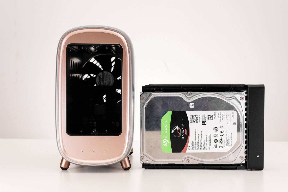 绿联私有云 DH2600 内部最高可装载四个硬盘,分别是两个 3.5 英寸机械硬盘 + 两个 M.2 固态硬盘,最高可扩容至 44TB 超大空间,按照刚才拍娃党手机可用空间来计算,约相当于手机可用空间的 4.4 万倍。