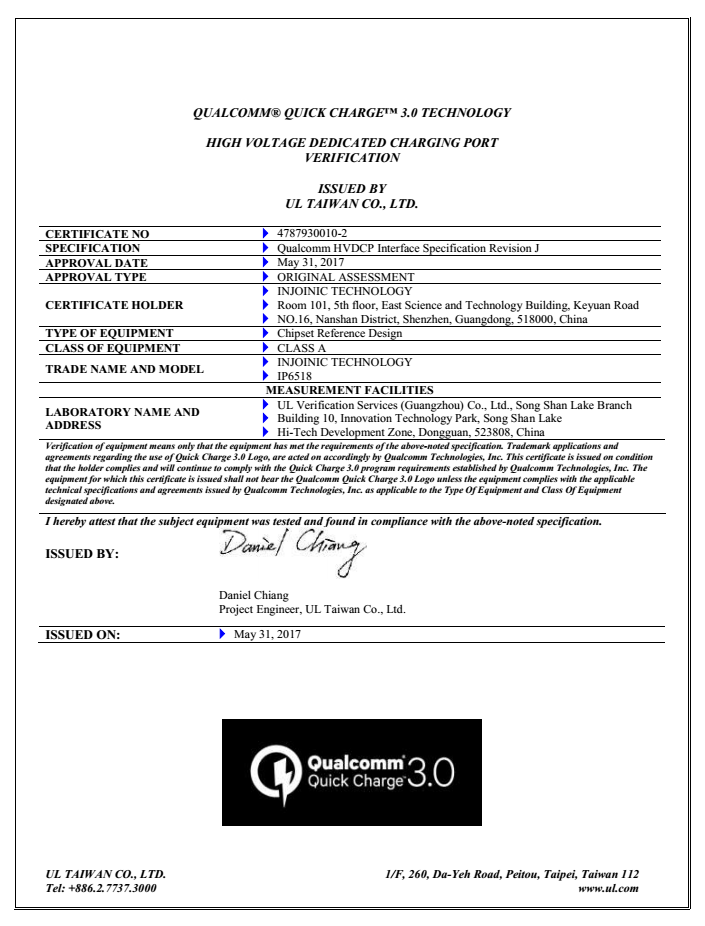 英集芯IP6518 通过高通QC3.0认证,证书编号4787930010-2