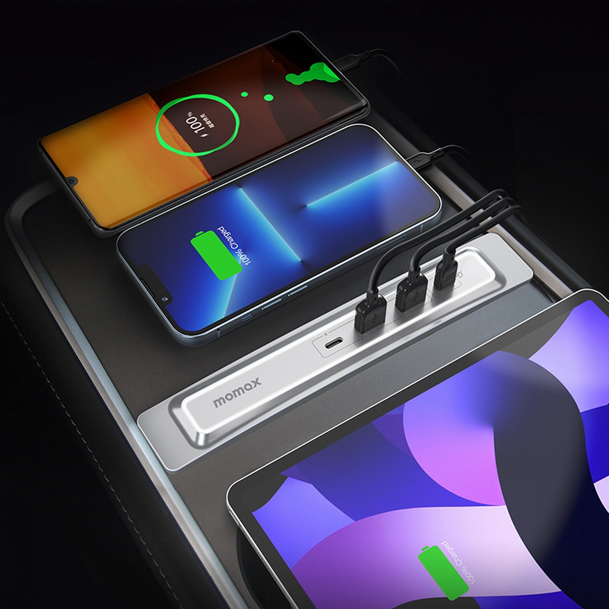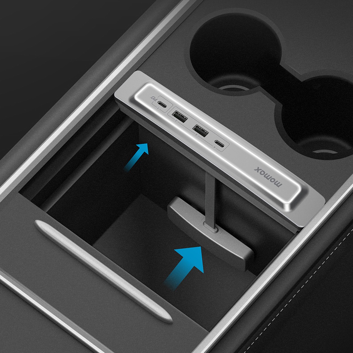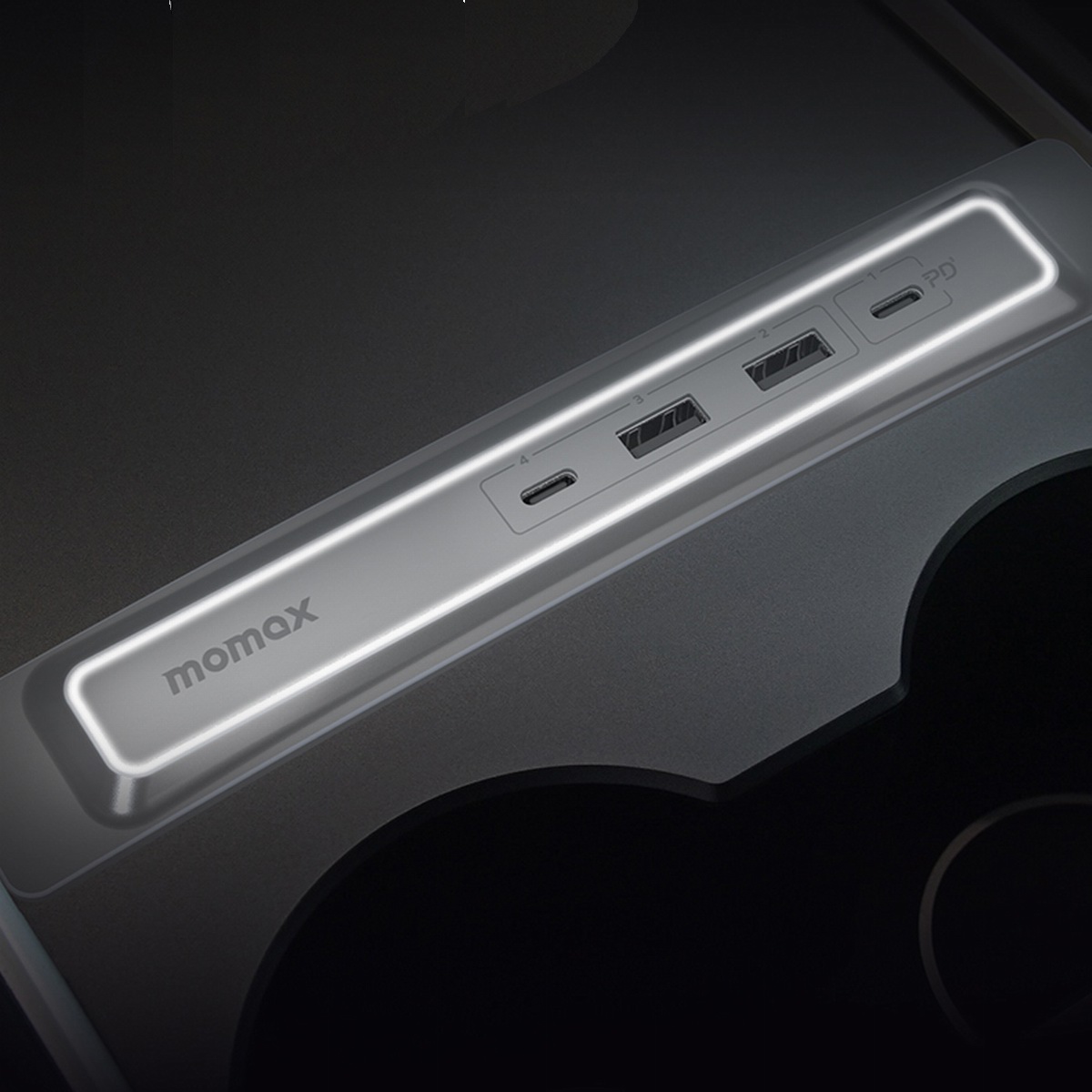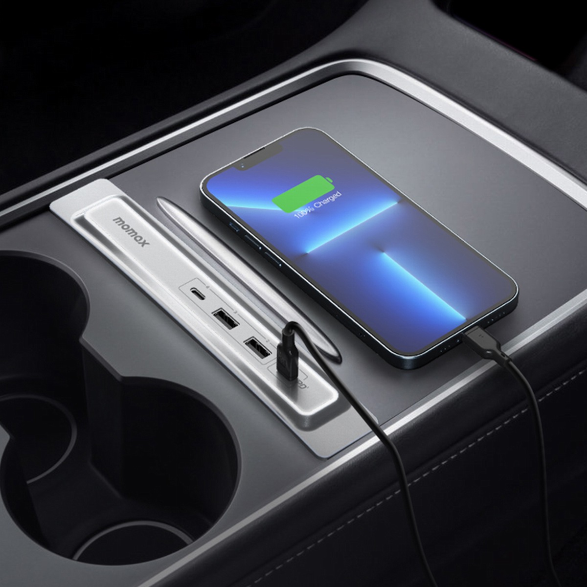 近日,MOMAX 推出了 Model3/Y 车型专用的快充转接扩展器,将接口延伸至扶手箱上面,并扩展为 2A2C 四个接口,改善了这个不完美的设计。