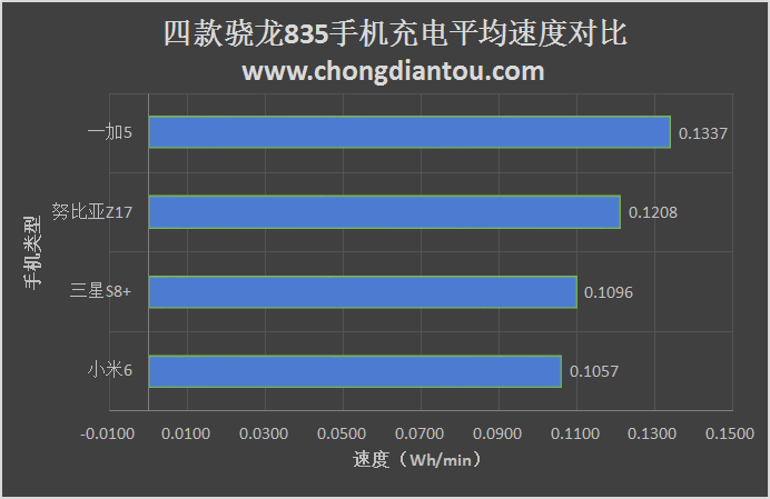 小编对这四款手机的平均充电速度做了一个简单统计(平均充电速度=电池能量/充电时间)。其中一加5平均充电速度最快,其后依次是Z17、三星S8+、小米6;当然,这里指的是平均充电速度。