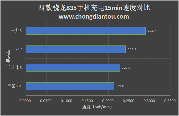 以手机的剩余20%电量为例,小编分别计算出了四款手机在充电15min内速度。可以看到,一加5的速度最快,约为0.2897Wh/min;其此次是努比亚Z17和小米6,三星S8+的充电速度最慢。所以,在利用碎片化的时间充电时,采用低压大电流快充方案的一加5在缓解手机没电这个问题上也有着最理想的效果。