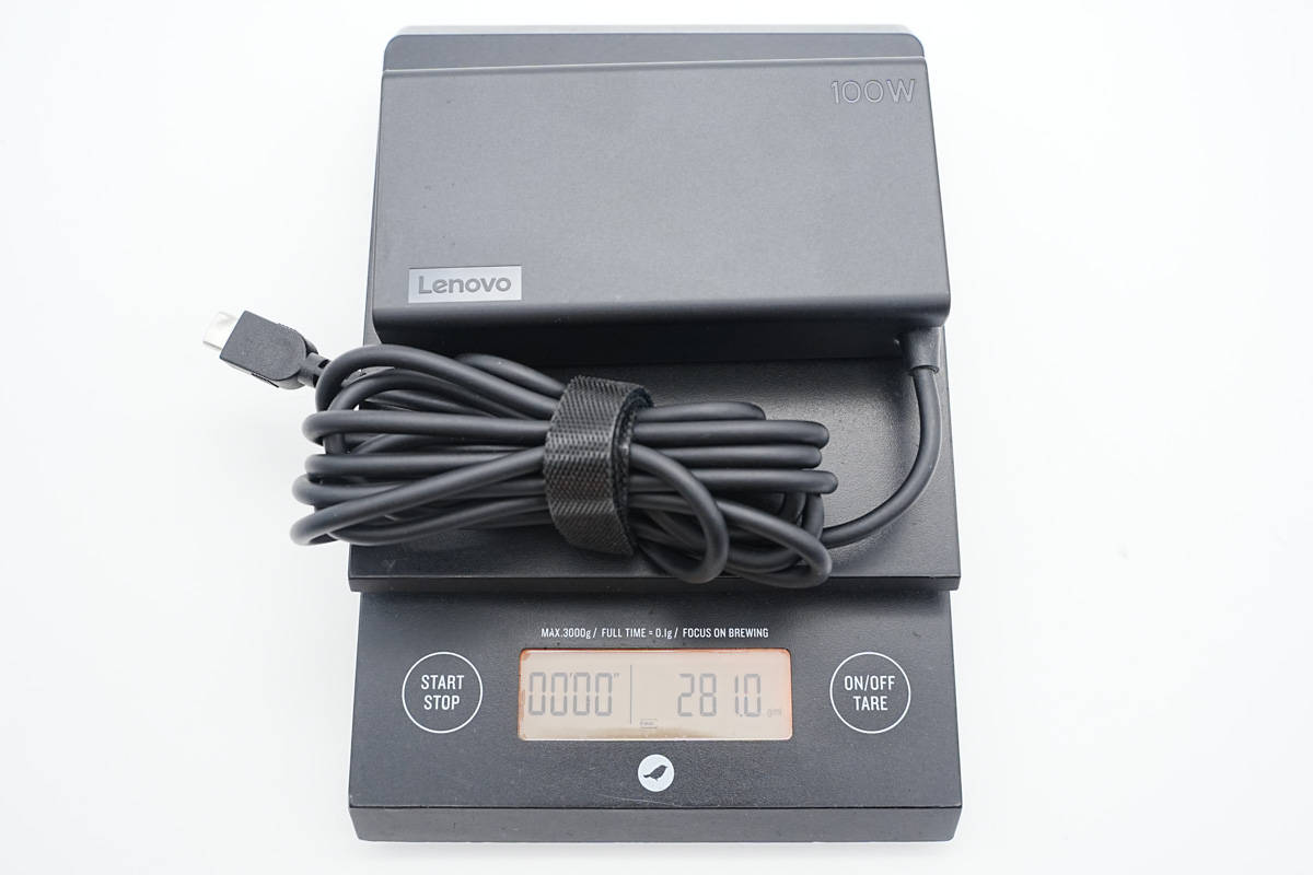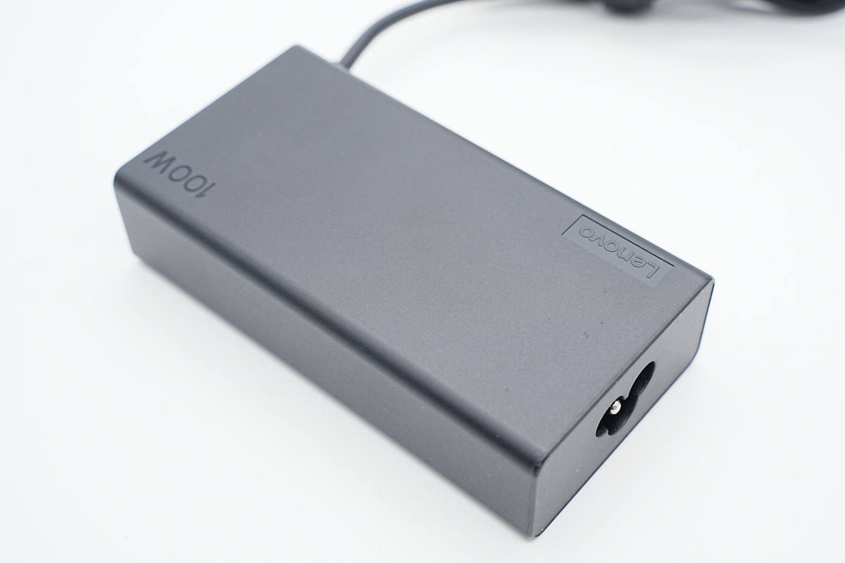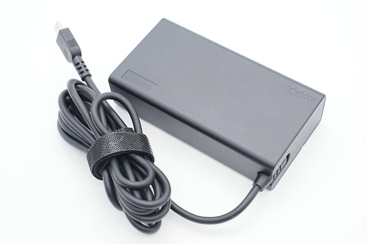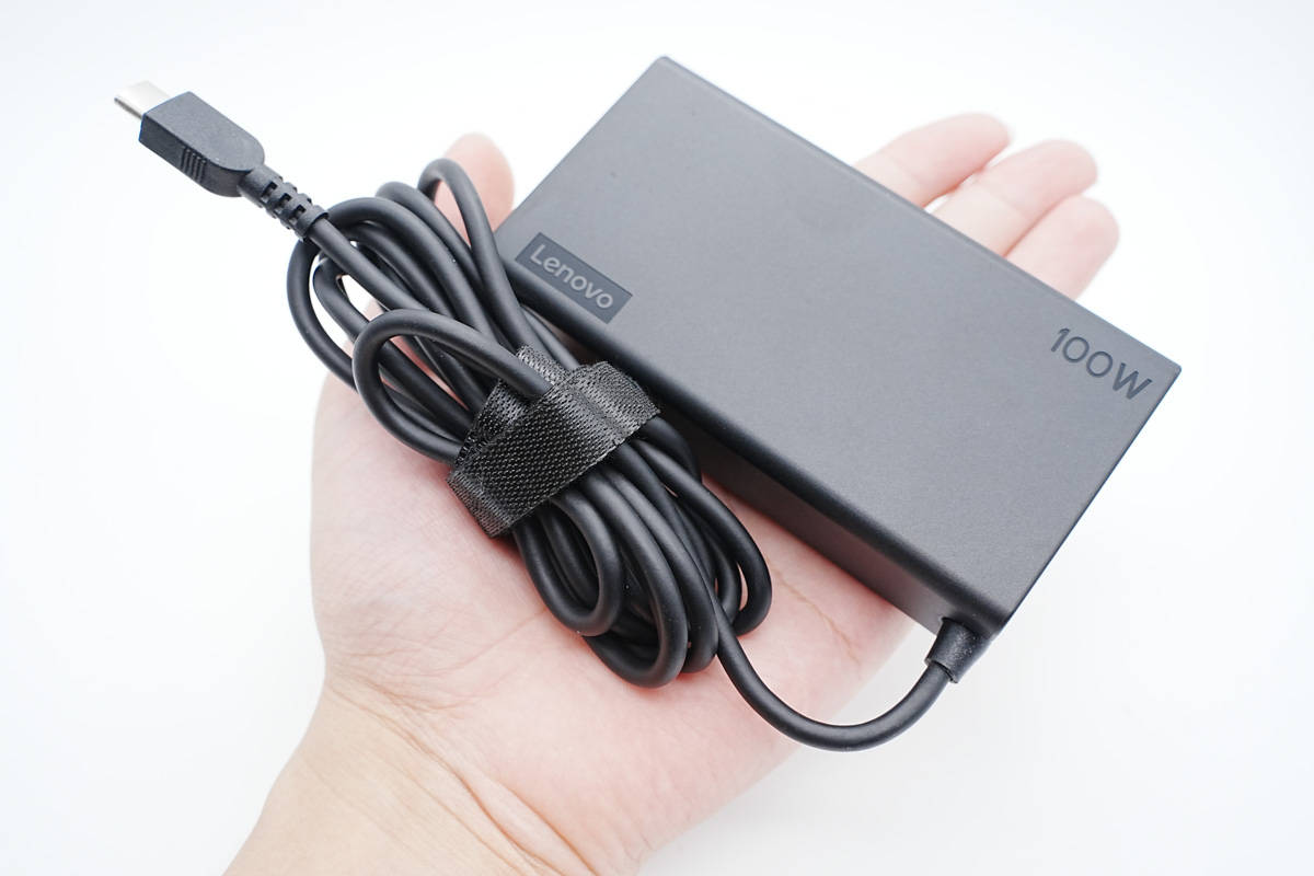 联想100W适配器机身是经典“板砖”造型,自带USB-C输出线缆,扎带捆扎整理。