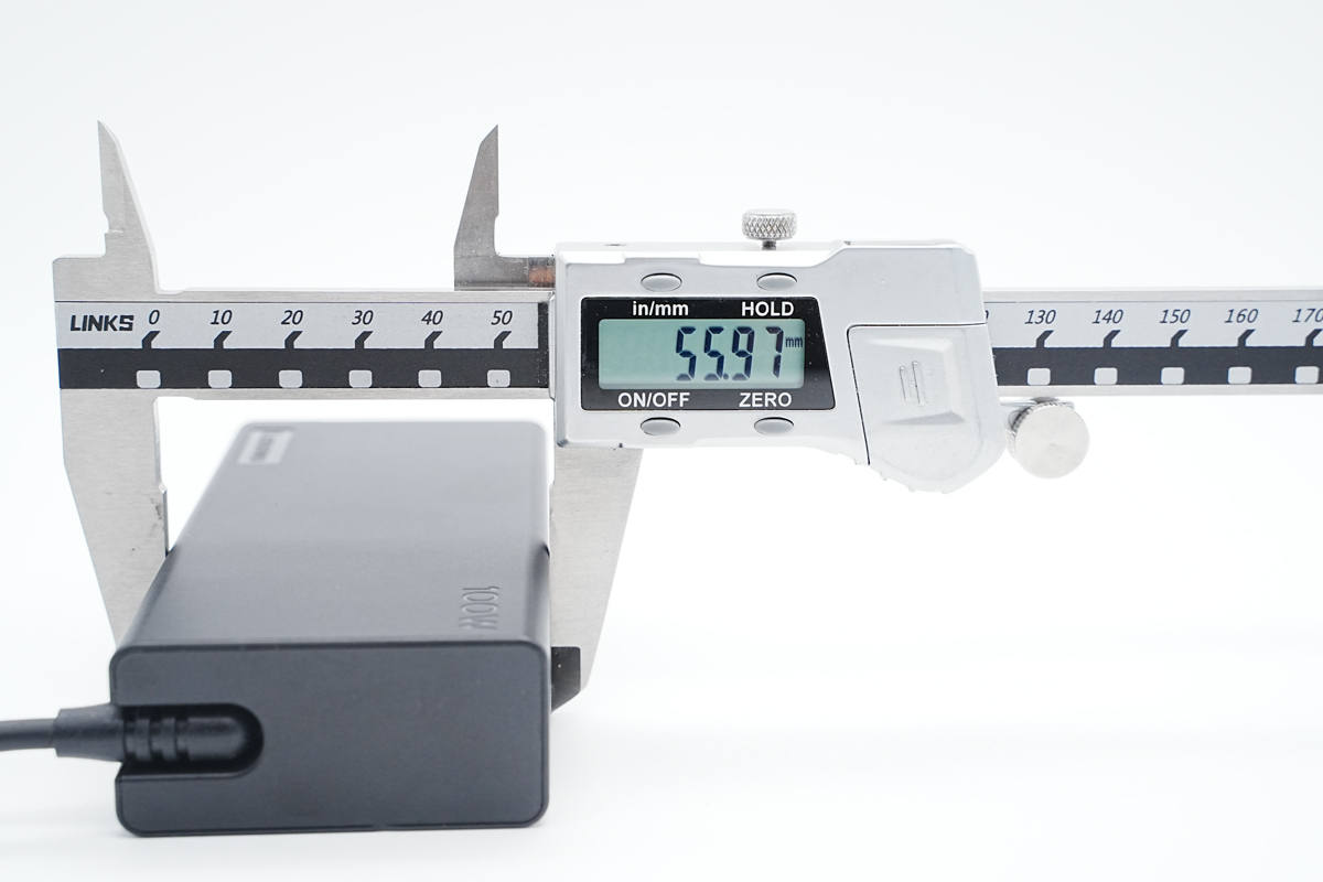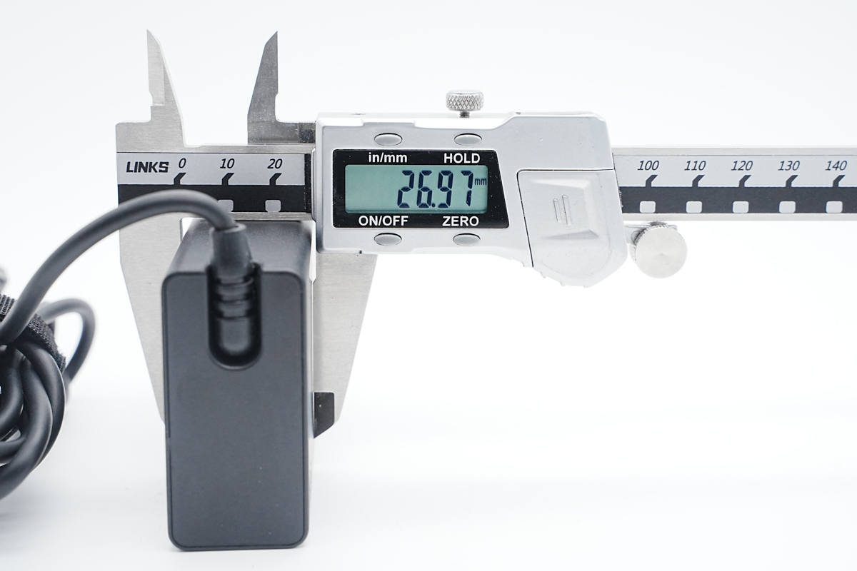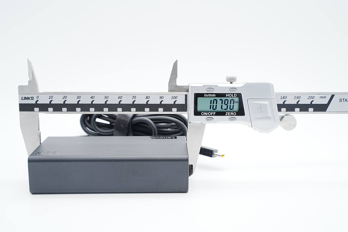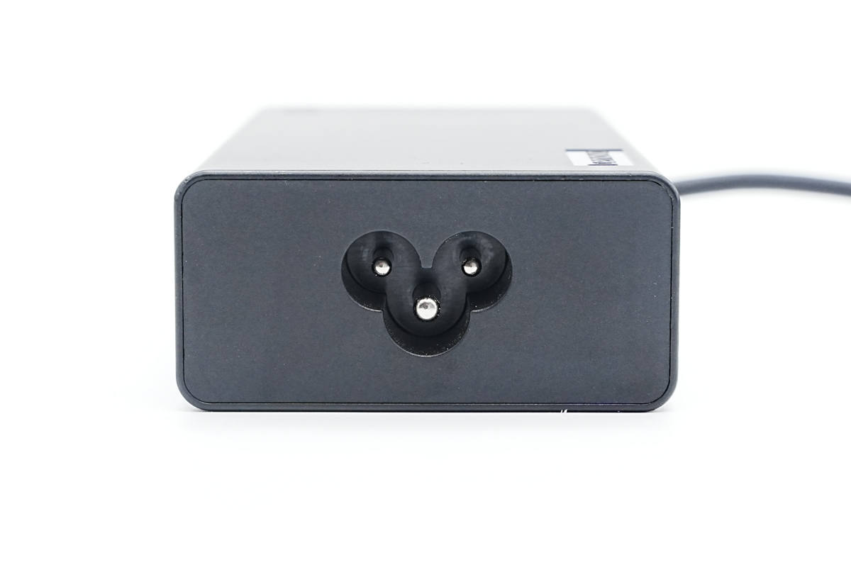 联想这款100W电源适配器作为笔记本电源来说,采用固定线缆配合梅花插头的设计,一方面较大的体积可以为电源提供充足的散热,确保长时间工作温升不会过高,另外梅花插头支持接地,在使用时不会出现麻手现象。