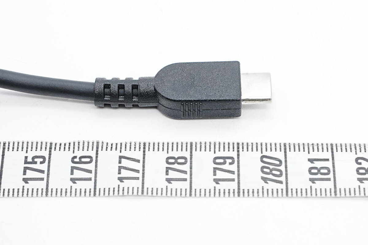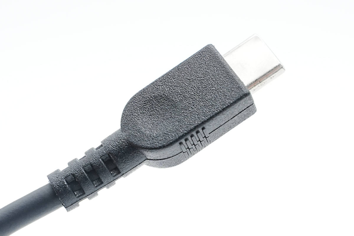 USB-C线头外壳磨砂,并设有小圆凹面,两侧设有凸齿,均是方便用户插拔使用。