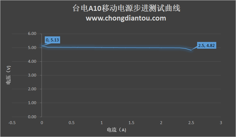 分别对台电A10移动电源的两个USB输出接口进行了步进测试测试.结果基本一致,空载电压约为5.13V,最大步进电流可以达到2.5A,超出标称的2.1A,有足够的安全余量。