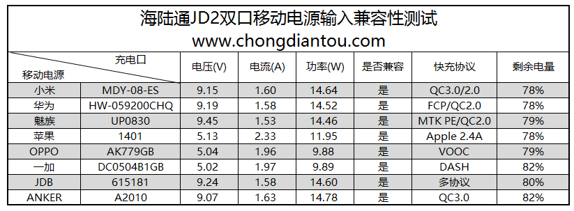 输入方面,主要测试了一些主流品牌手机的原装充电器的充电效果。测试结果如下: