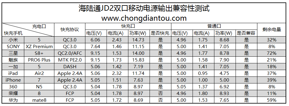 实测海陆通JD2移动电源快充口支持魅族、小米、三星、索尼、苹果等品牌手机快速充电。同时也支持苹果平板全速充电。