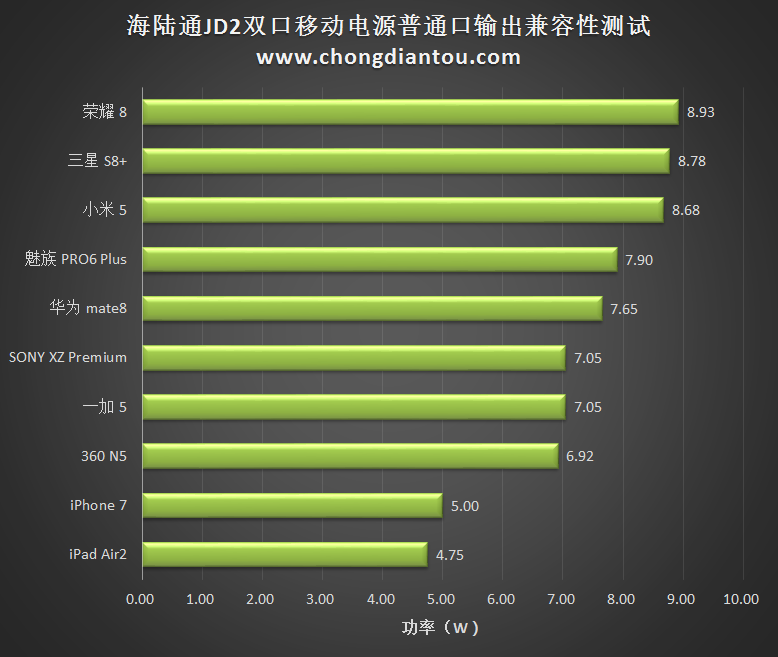 普通口的兼容性也很不错。得益于其最大5V/2.4A输出能力的设计,在同样应对这些品牌手机时,均以比较快的速度充电,其中荣耀8、三星 S8+、小米 5三款手机的充电速度最快,功率约为9W。