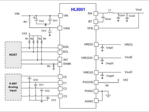 值得一提的是芯片在提供降压输出的同时,还内置4路40V耐压的模拟电压采集电压比较器,可以连接ACC、LED灯、刹车灯电源,为系统提供电压参照,HL8001 还提供了4位的ADC,可以通过VIN来检测电池电压是过高还是过低,提前预警,所有的参数通过寄存器保存,主控芯片可由I2C通信接口输出。