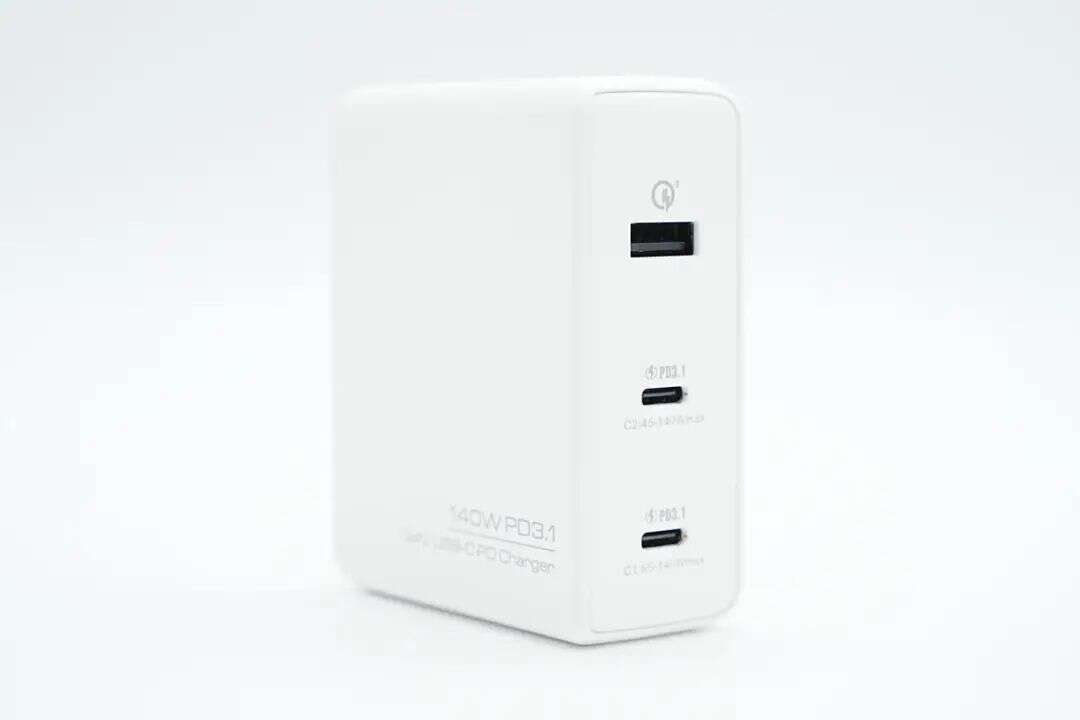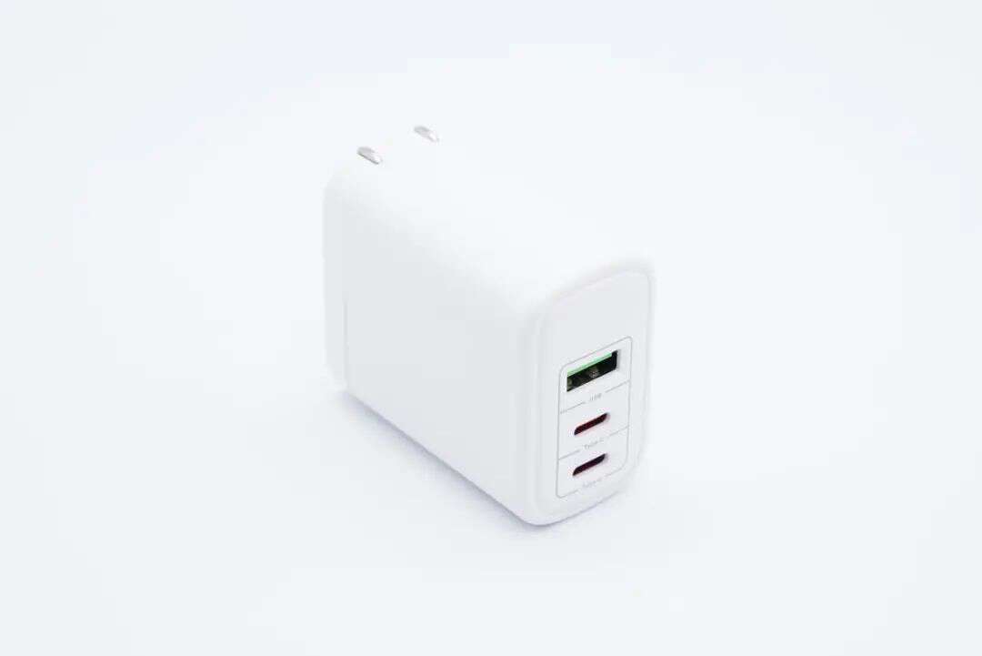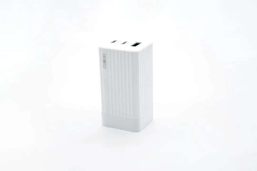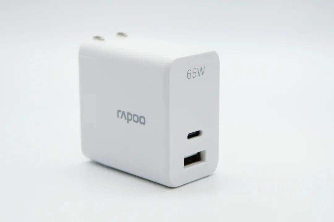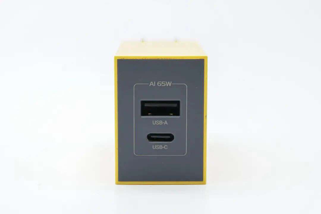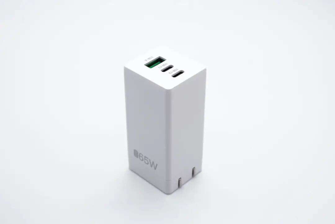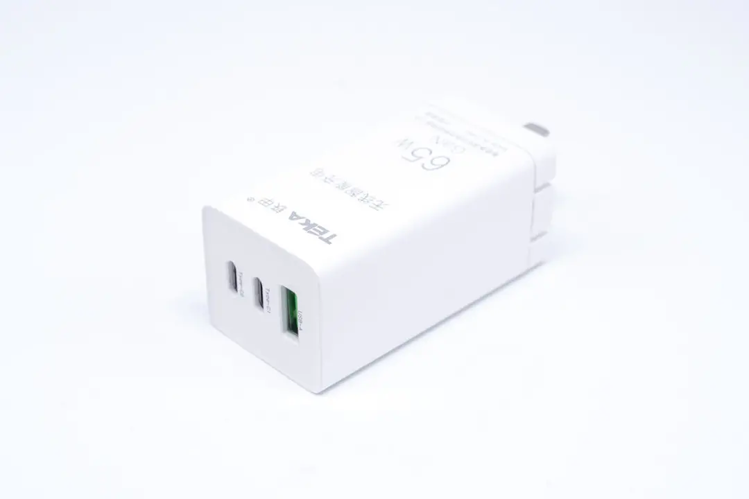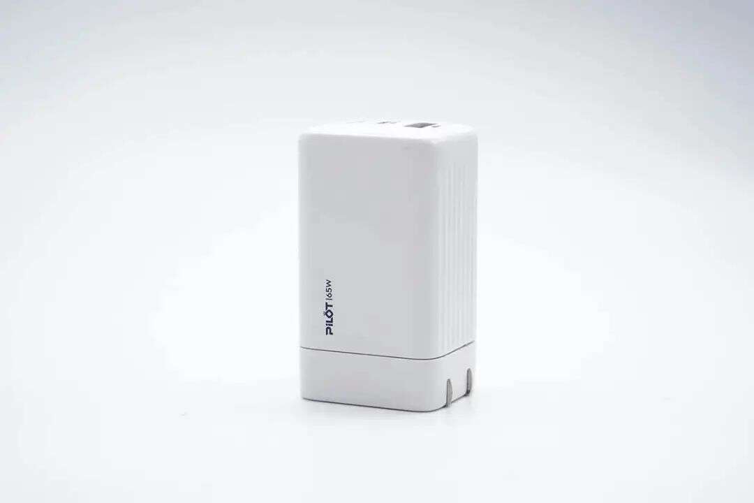 这款65W氮化镓充电器采用清新的白色设计,依旧为长条柱状造型,小巧便携,独特的圆角切面外观设计,使产品别具一格。充电器配备折叠插脚,携带方便,具备2C1A输出接口,支持65W PD快充以及3.3-21V 3A PPS快充,对安卓手机的快充支持很不错。