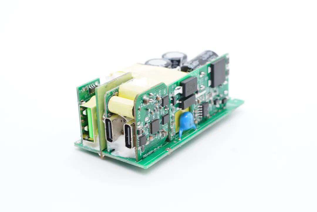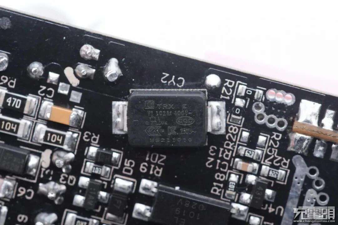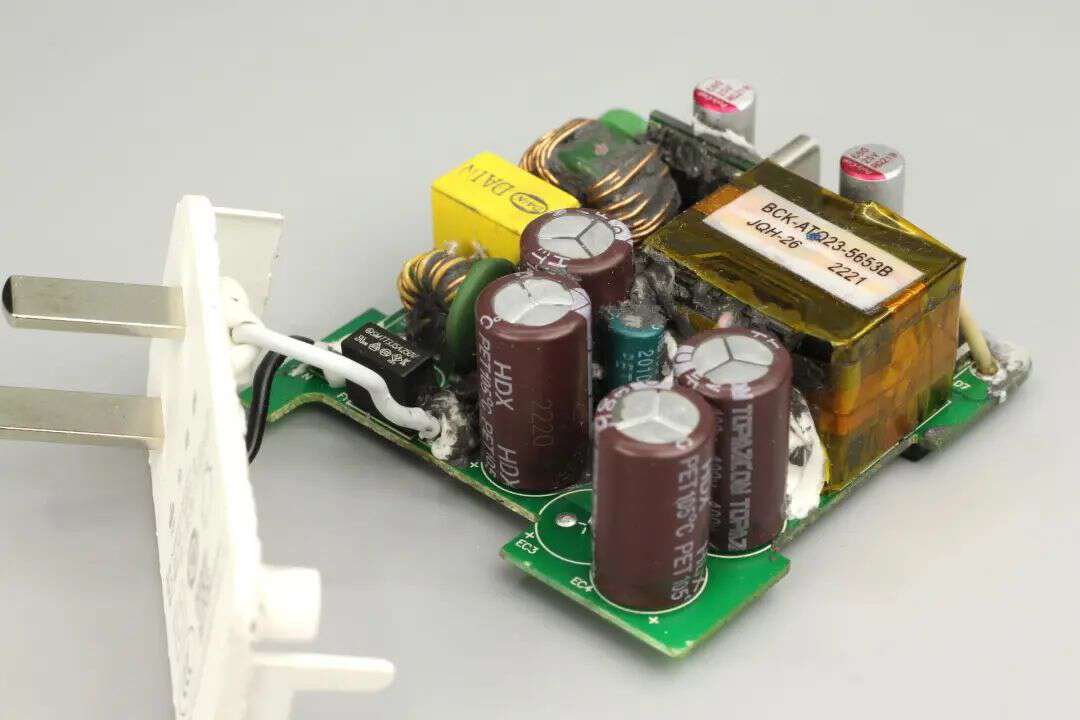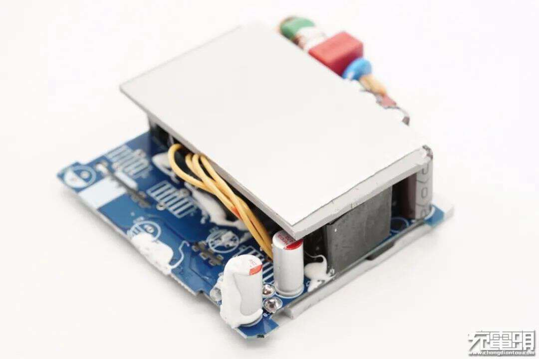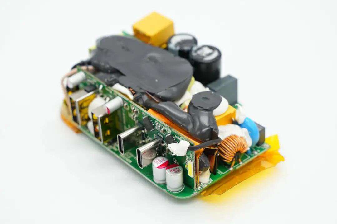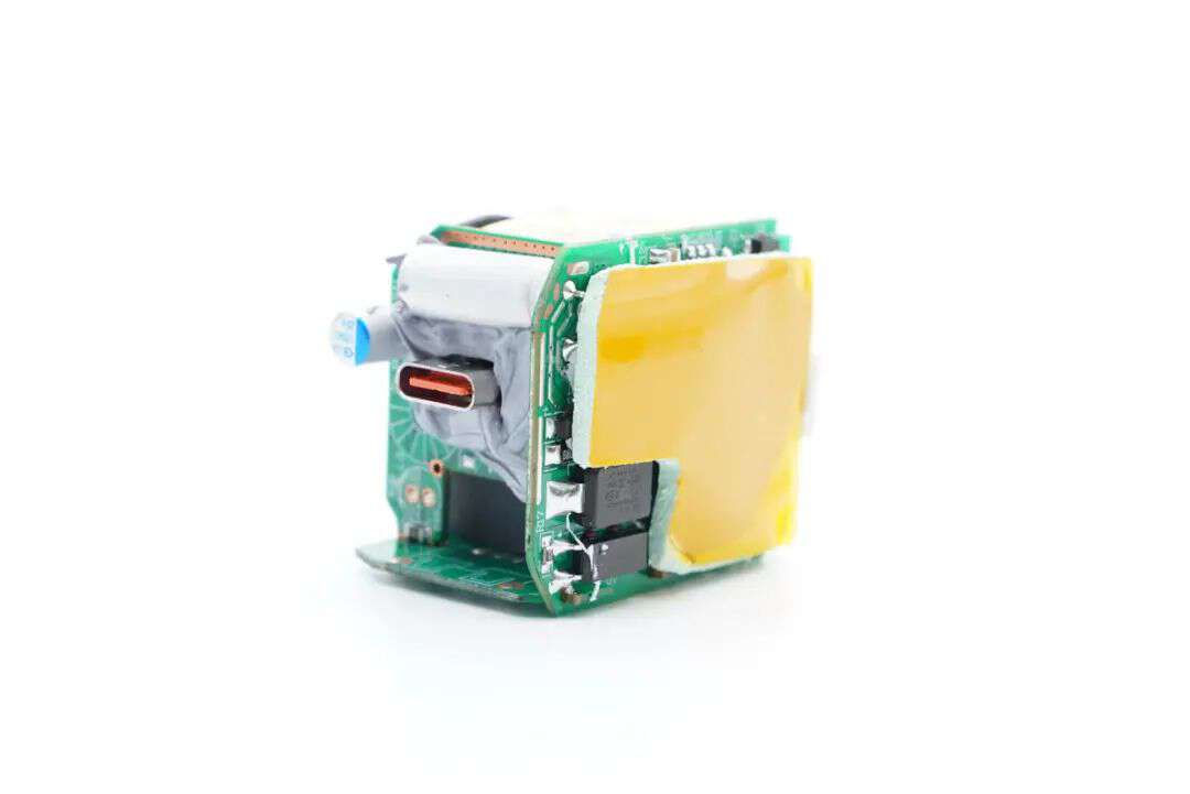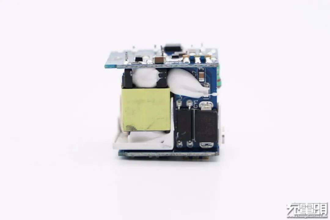 倍思插座内部快充模块采用灌胶工艺,能够增强散热性能,提升耐候性的同时提升保护性能,有效避免插线板在使用过程中中不慎跌落损坏,更加经久耐用。插座内部使用特锐祥TMY1102M和快充模块使用恩智浦TEA2016AAT+TEA1995 PFC+LLC+同步整流方案,恒压输出,由五块小板焊接组成为一个整体。