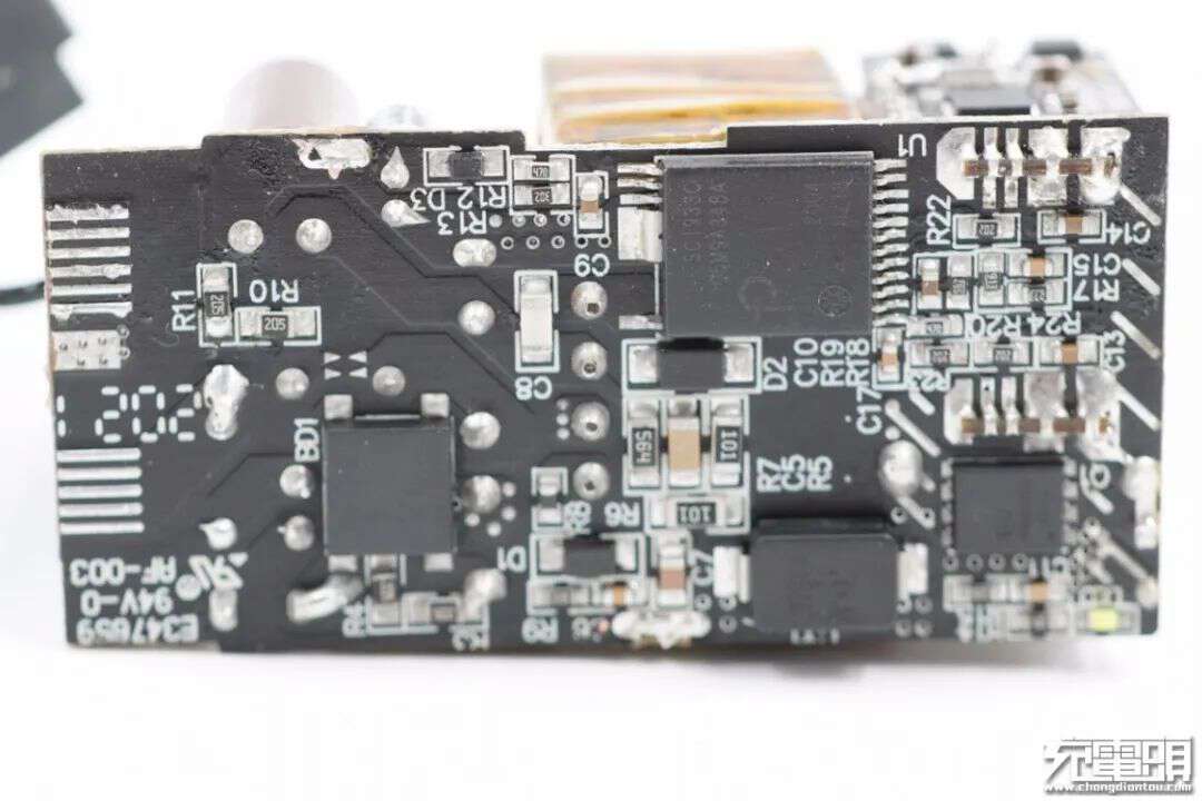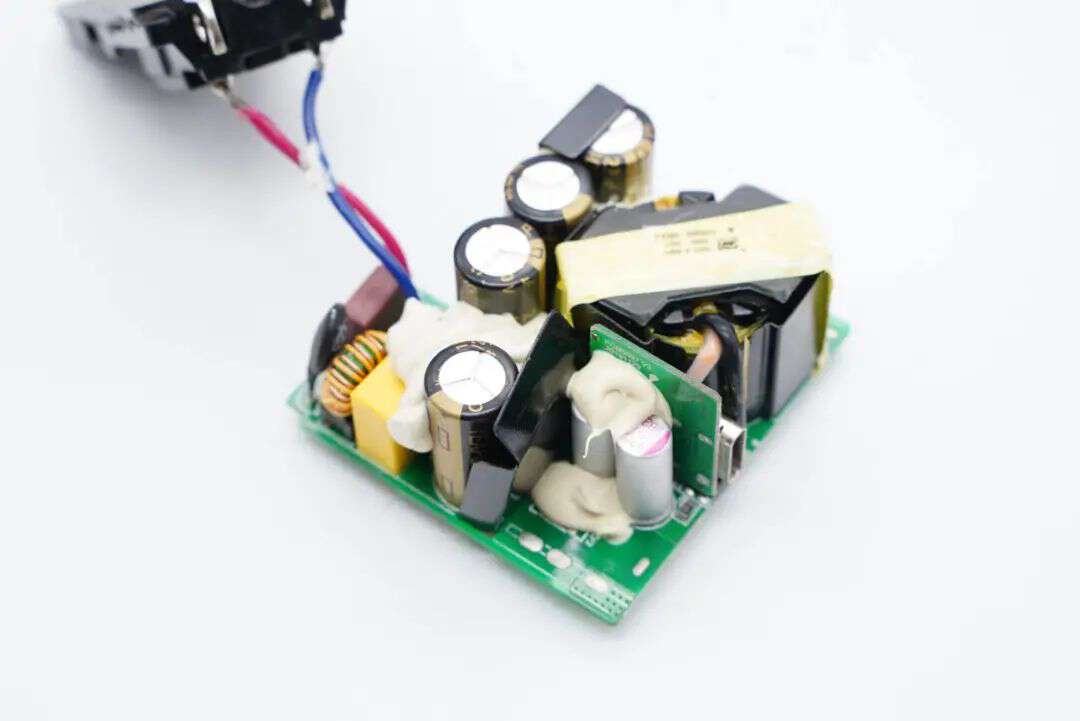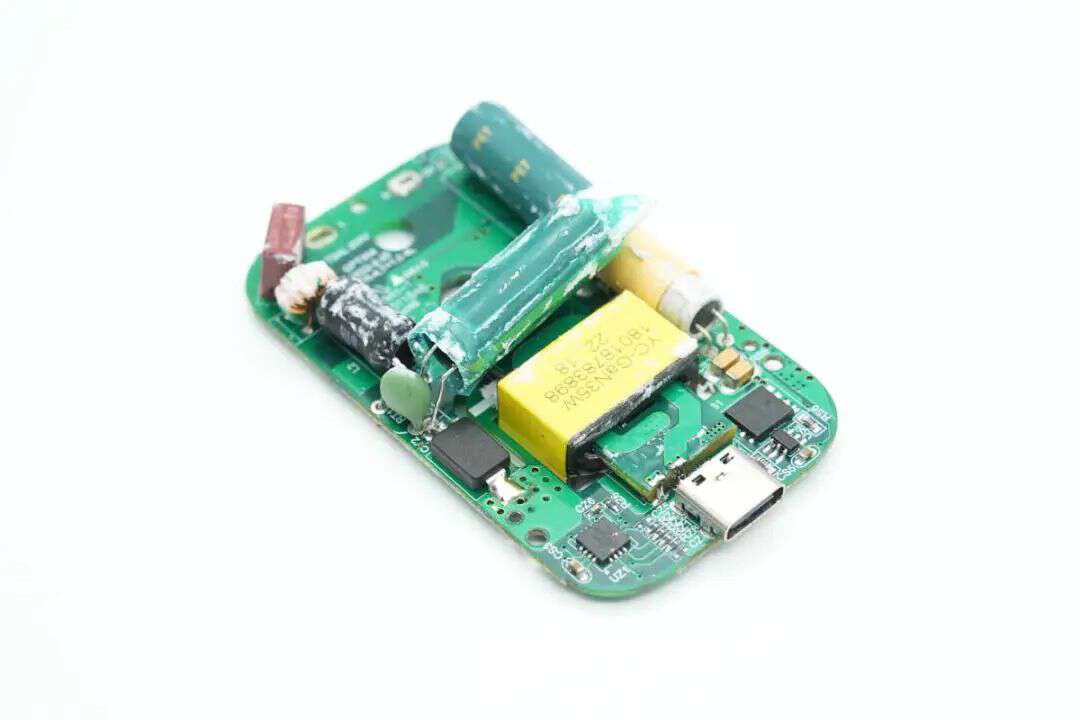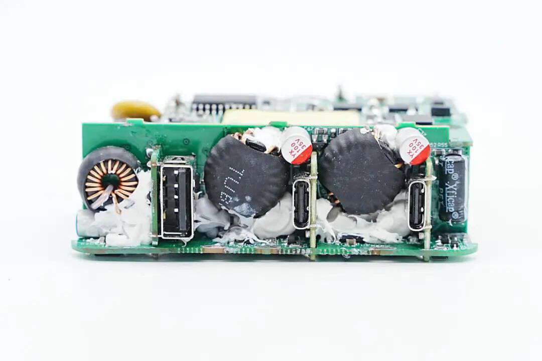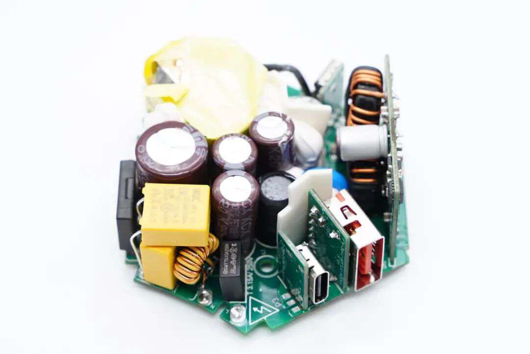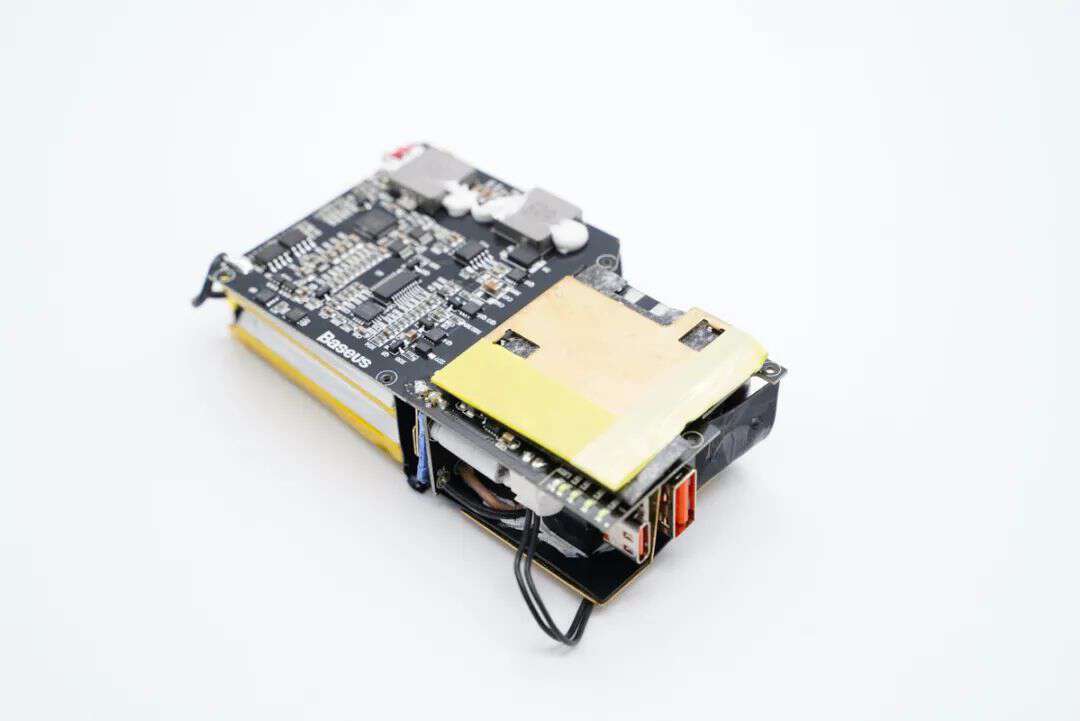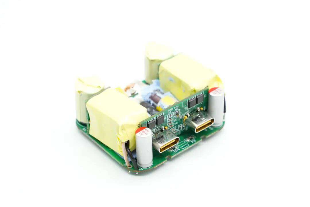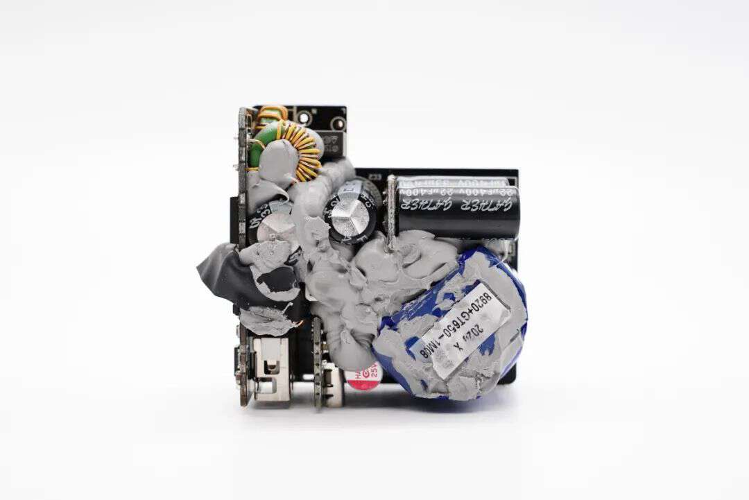 倍思插座内部快充模块采用灌胶工艺,能够增强散热性能,提升耐候性的同时提升保护性能,有效避免插线板在使用过程中中不慎跌落损坏,更加经久耐用。插座内部使用特锐祥TMY1102M和快充模块使用恩智浦TEA2016AAT+TEA1995 PFC+LLC+同步整流方案,恒压输出,由五块小板焊接组成为一个整体。