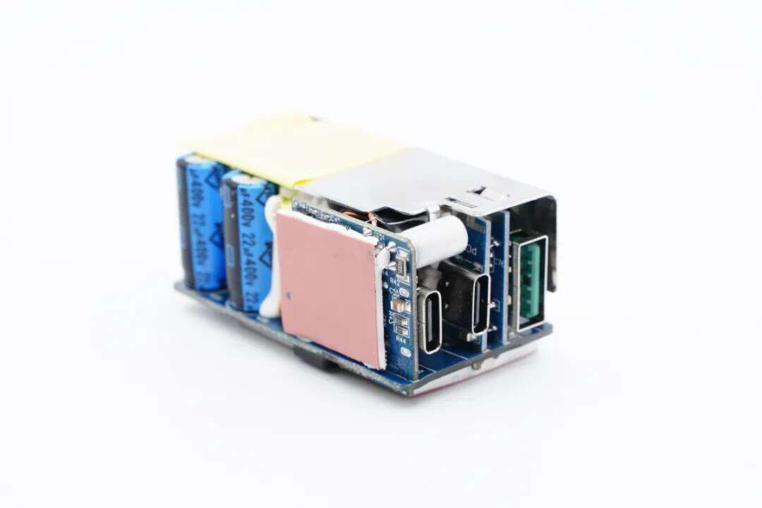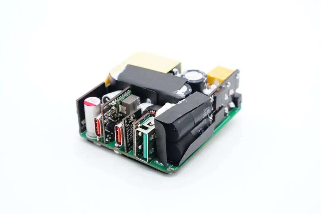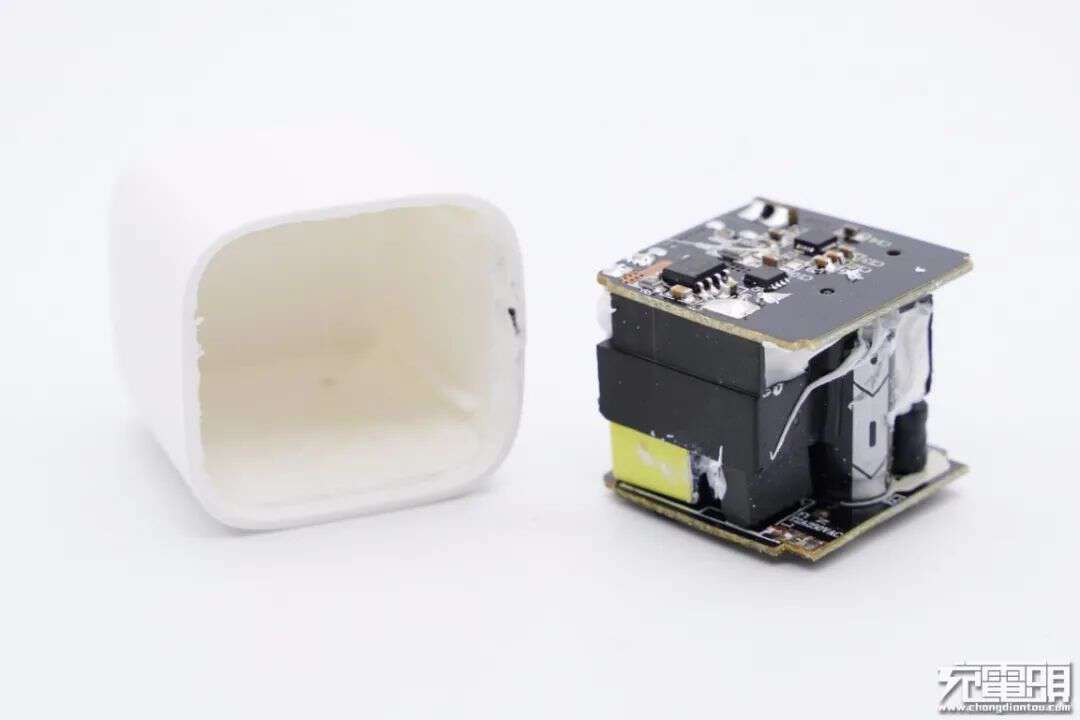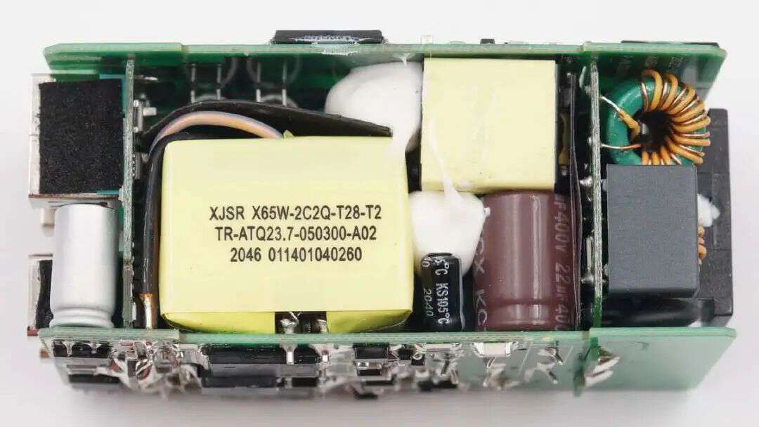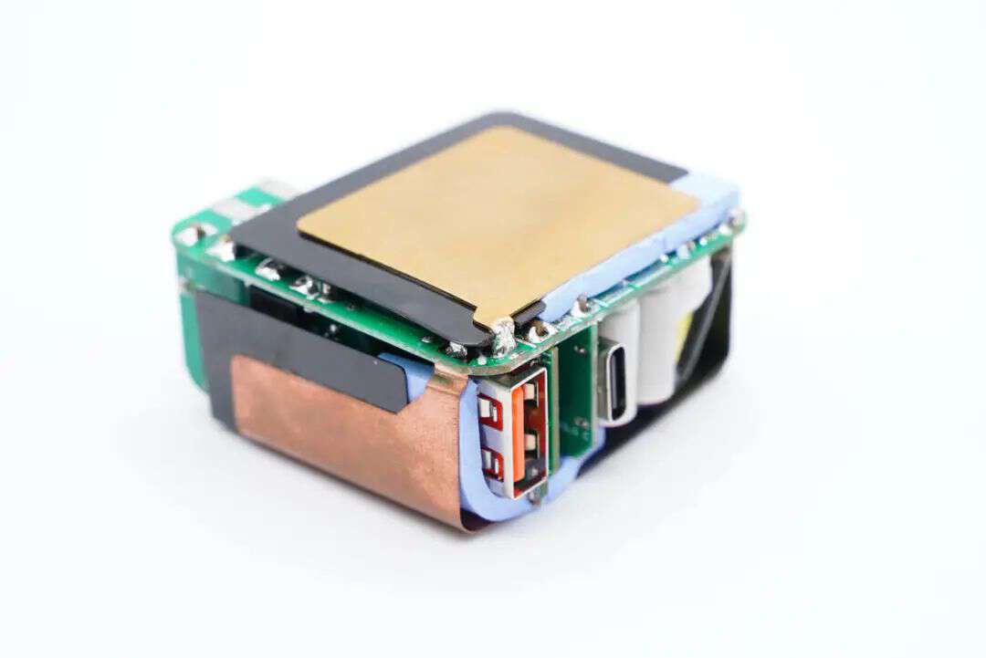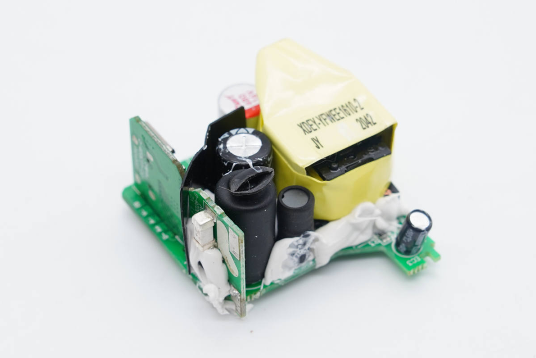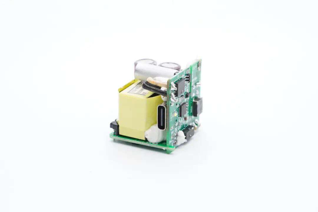 倍思插座内部快充模块采用灌胶工艺,能够增强散热性能,提升耐候性的同时提升保护性能,有效避免插线板在使用过程中中不慎跌落损坏,更加经久耐用。插座内部使用特锐祥TMY1102M和快充模块使用恩智浦TEA2016AAT+TEA1995 PFC+LLC+同步整流方案,恒压输出,由五块小板焊接组成为一个整体。