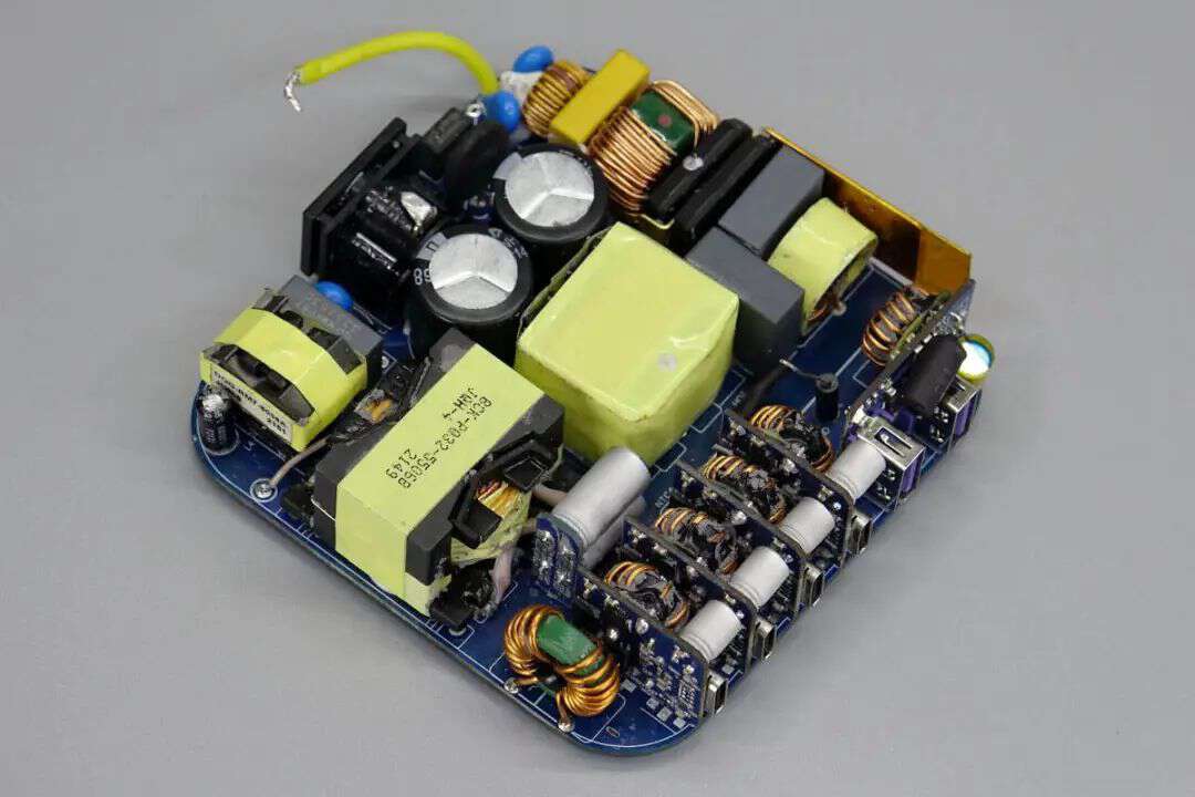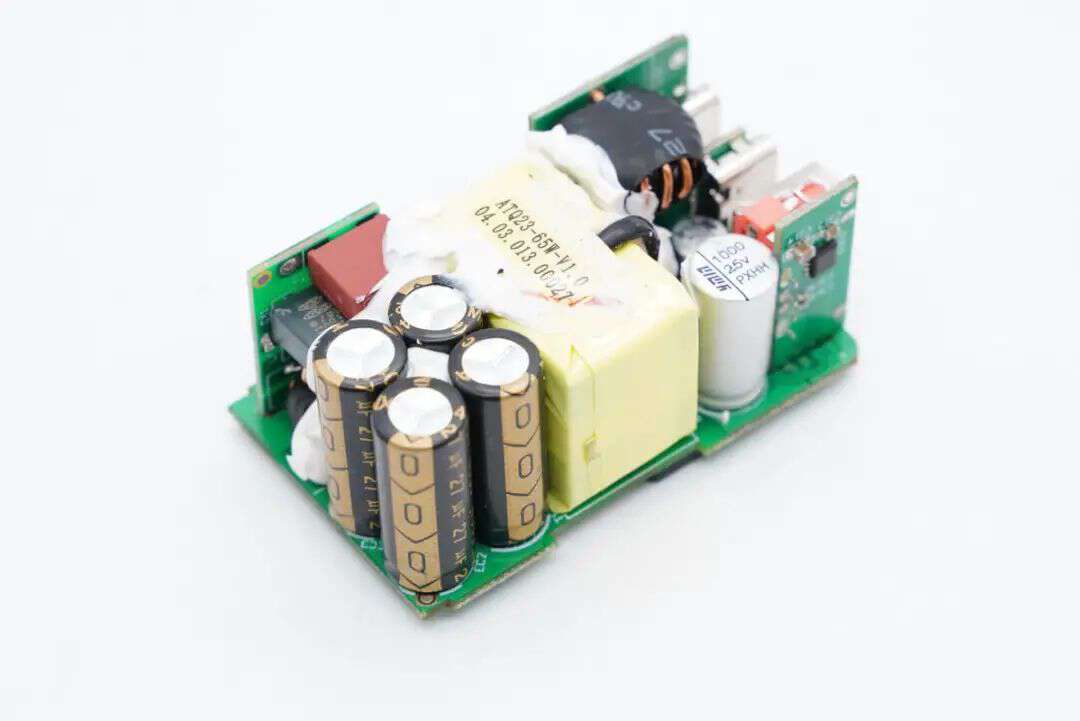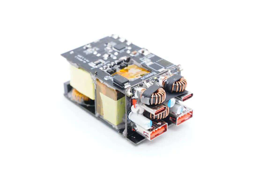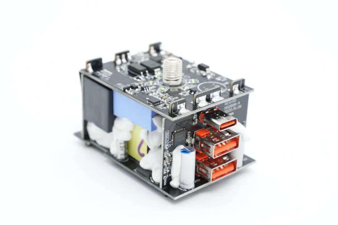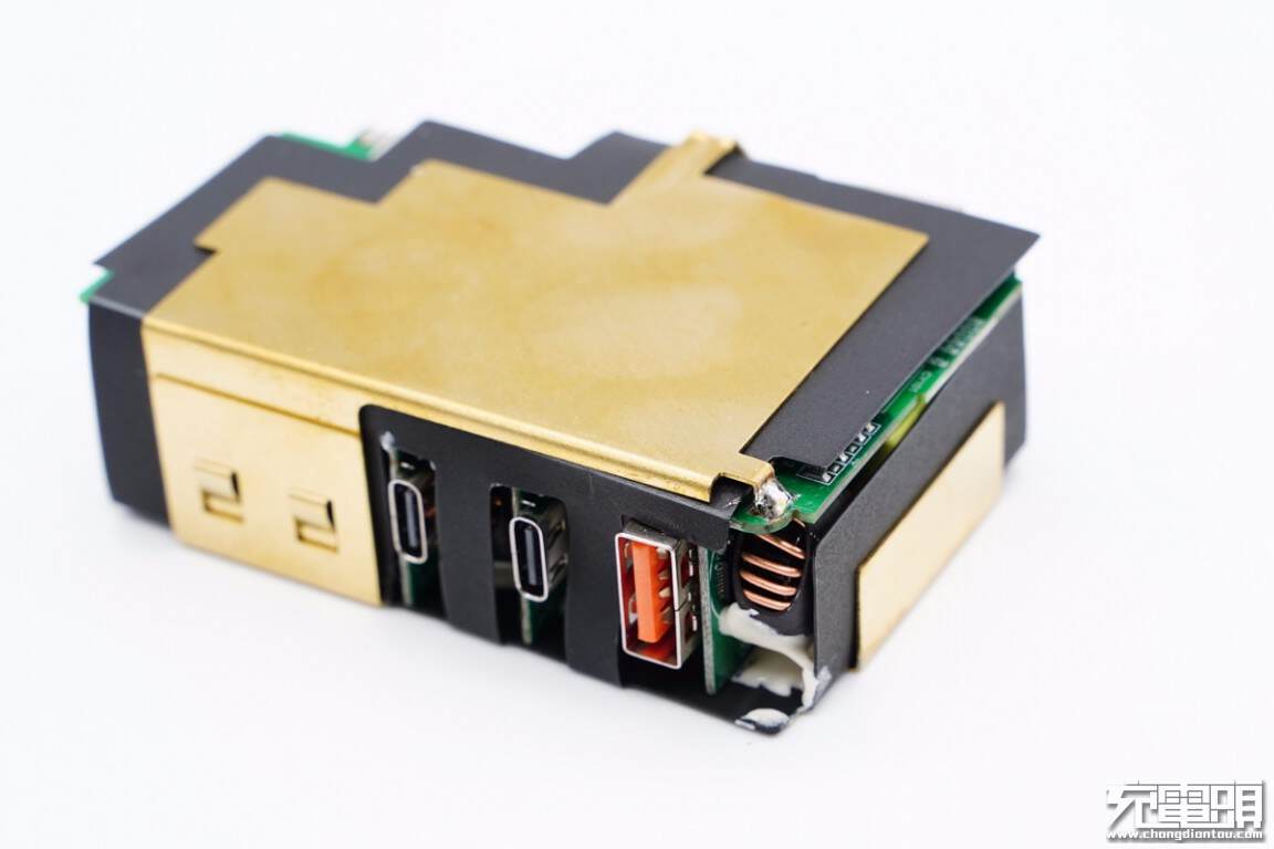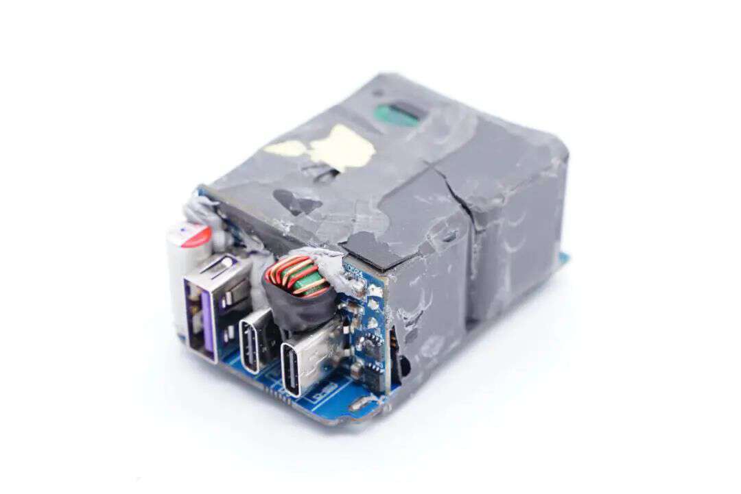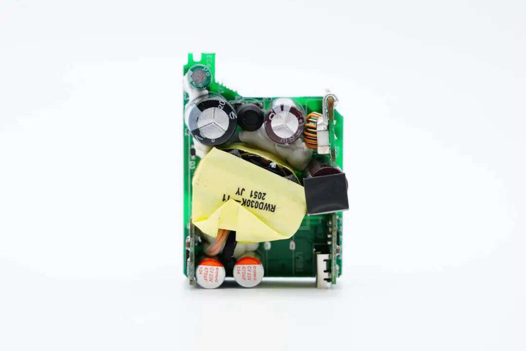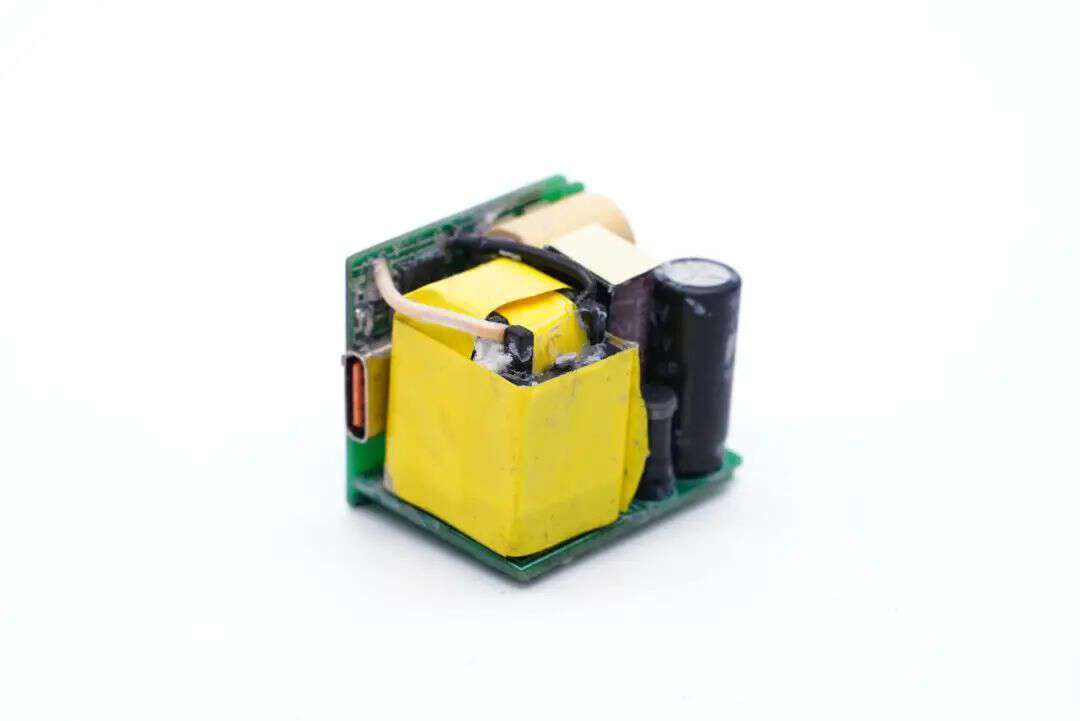 倍思插座内部快充模块采用灌胶工艺,能够增强散热性能,提升耐候性的同时提升保护性能,有效避免插线板在使用过程中中不慎跌落损坏,更加经久耐用。插座内部使用特锐祥TMY1102M和快充模块使用恩智浦TEA2016AAT+TEA1995 PFC+LLC+同步整流方案,恒压输出,由五块小板焊接组成为一个整体。