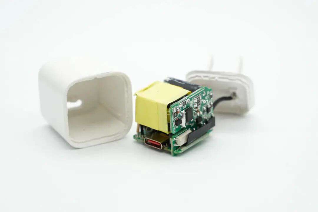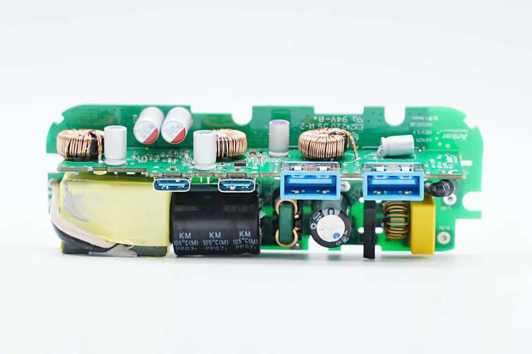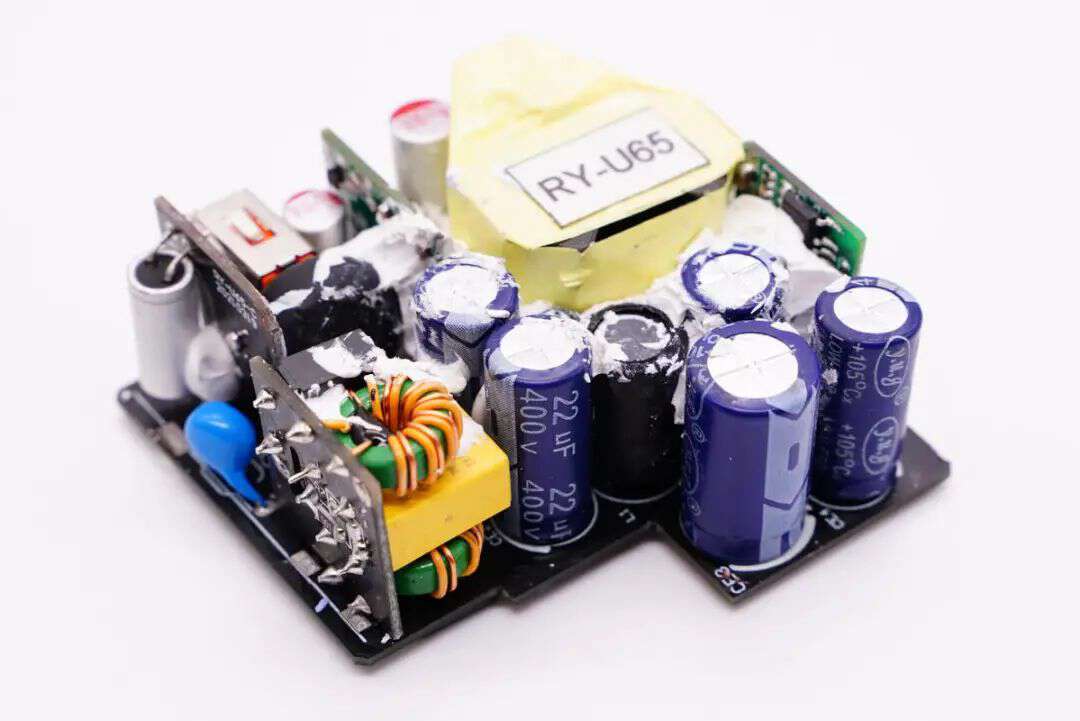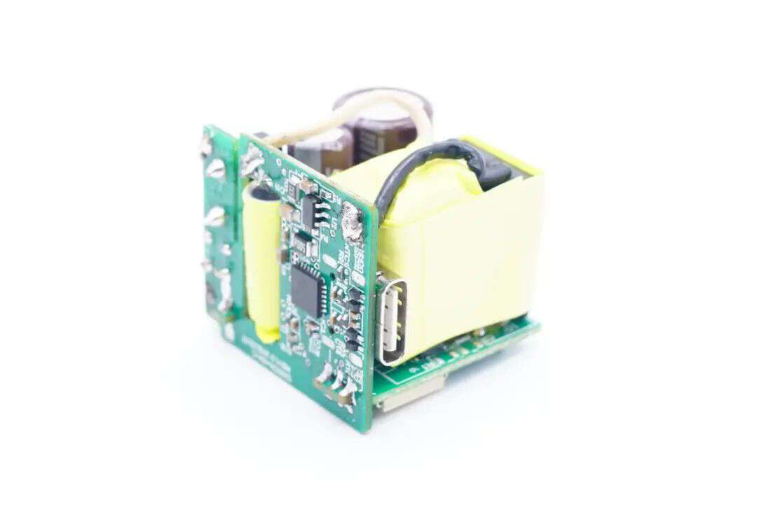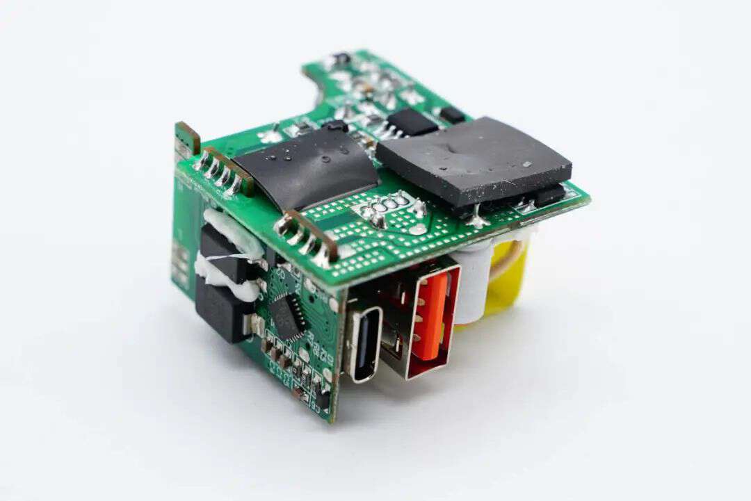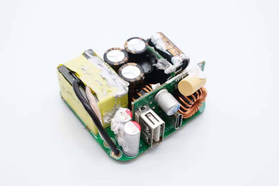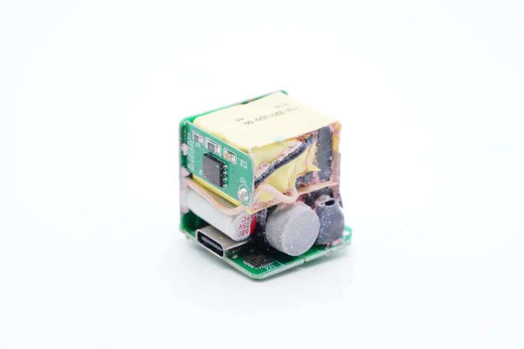 倍思插座内部快充模块采用灌胶工艺,能够增强散热性能,提升耐候性的同时提升保护性能,有效避免插线板在使用过程中中不慎跌落损坏,更加经久耐用。插座内部使用特锐祥TMY1102M和快充模块使用恩智浦TEA2016AAT+TEA1995 PFC+LLC+同步整流方案,恒压输出,由五块小板焊接组成为一个整体。