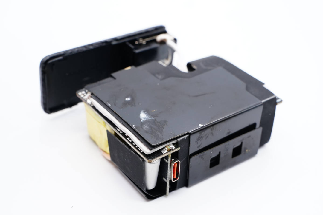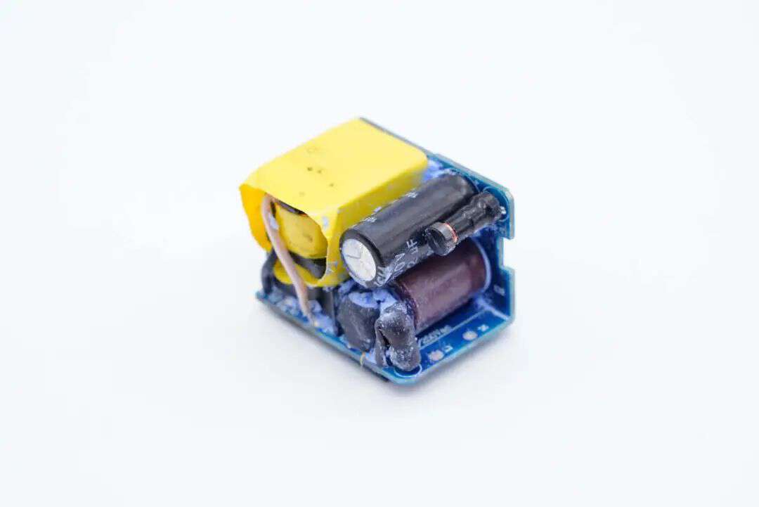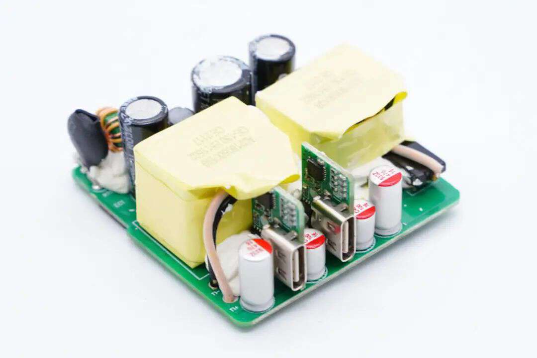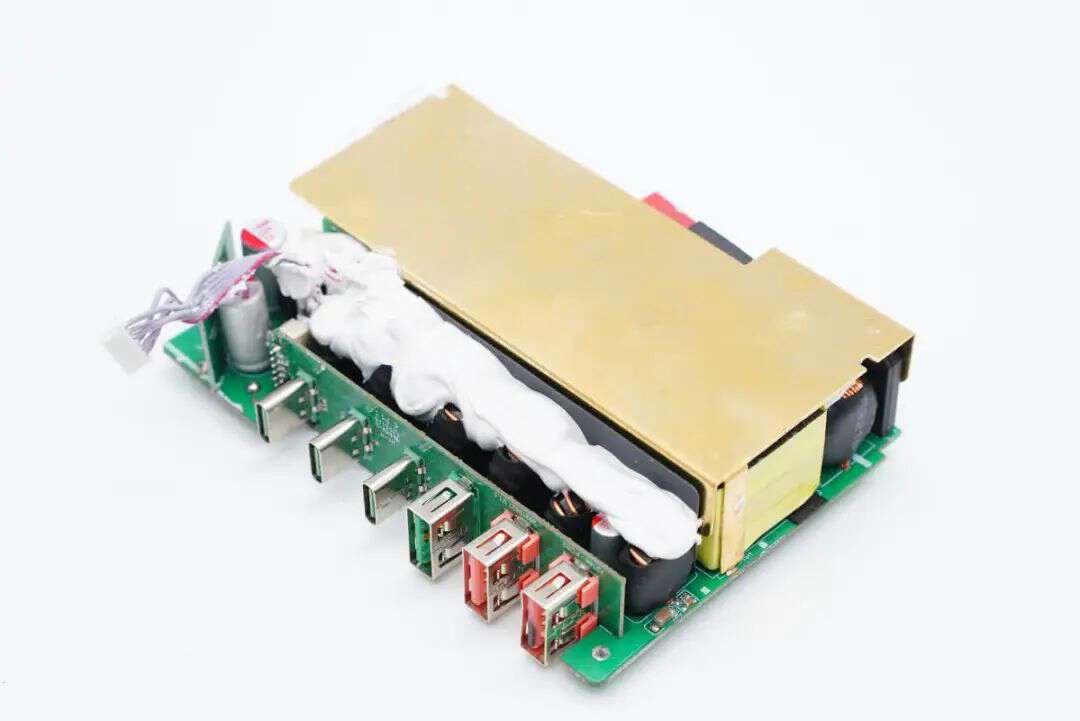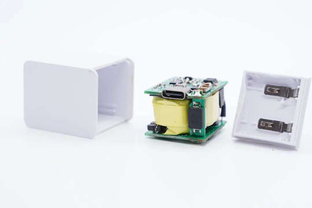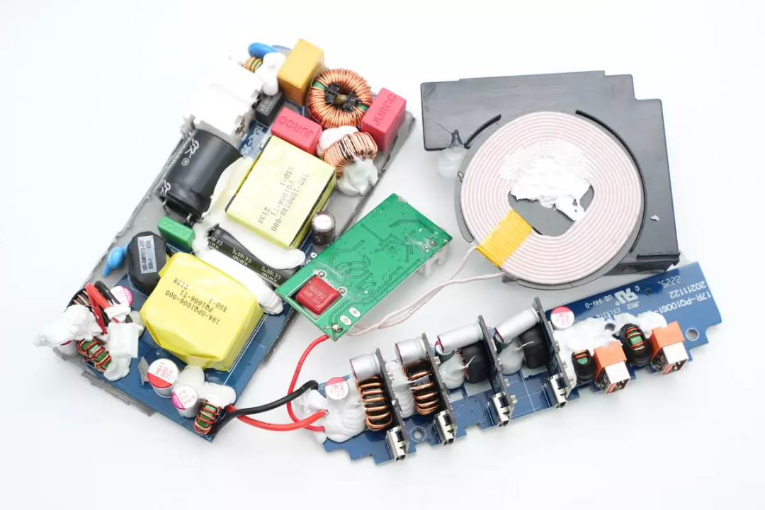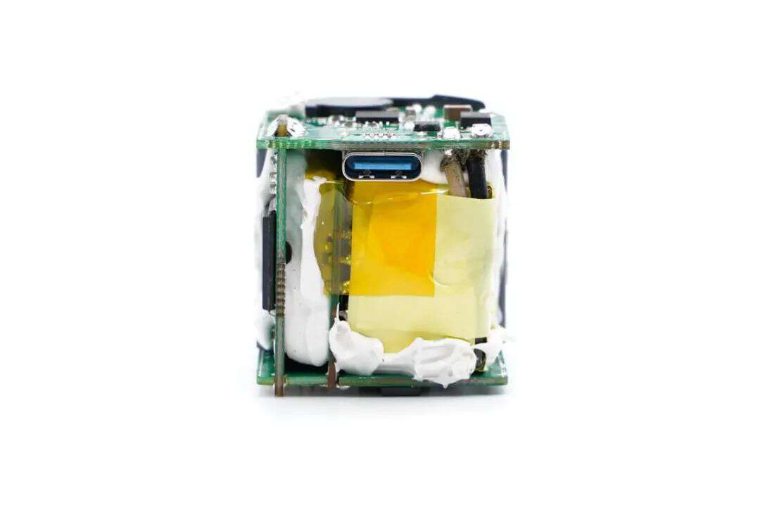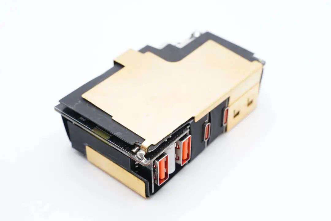 倍思插座内部快充模块采用灌胶工艺,能够增强散热性能,提升耐候性的同时提升保护性能,有效避免插线板在使用过程中中不慎跌落损坏,更加经久耐用。插座内部使用特锐祥TMY1102M和快充模块使用恩智浦TEA2016AAT+TEA1995 PFC+LLC+同步整流方案,恒压输出,由五块小板焊接组成为一个整体。