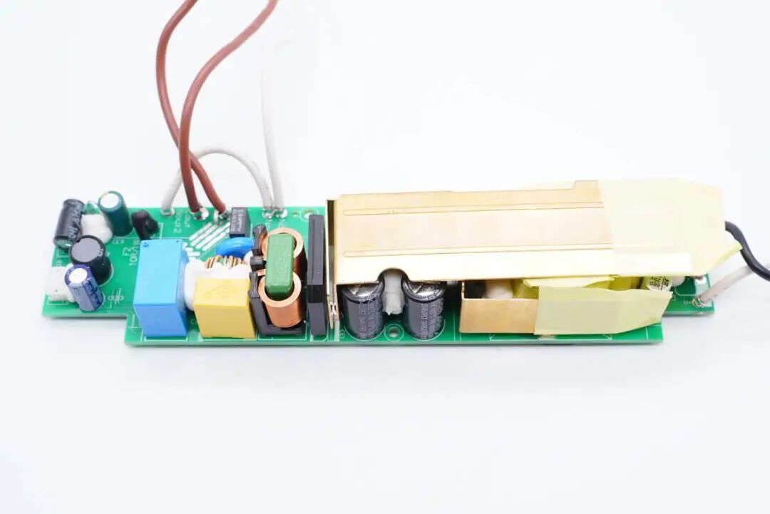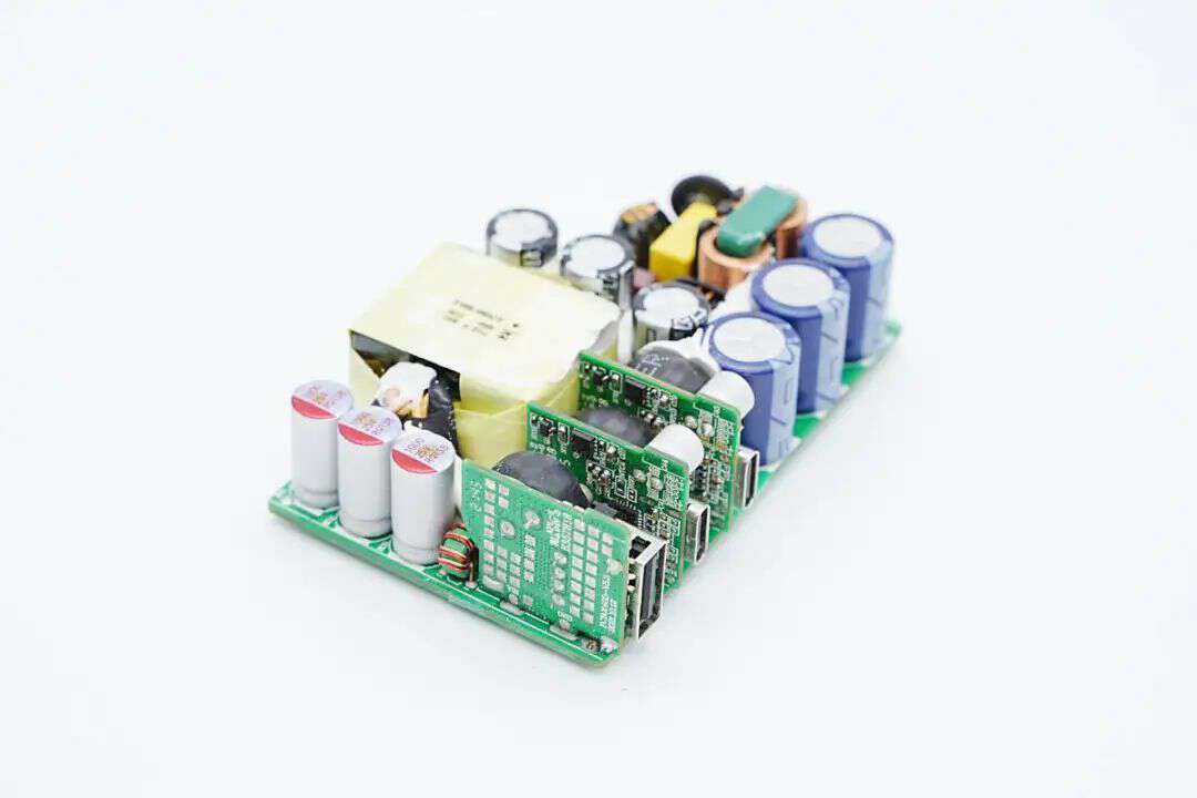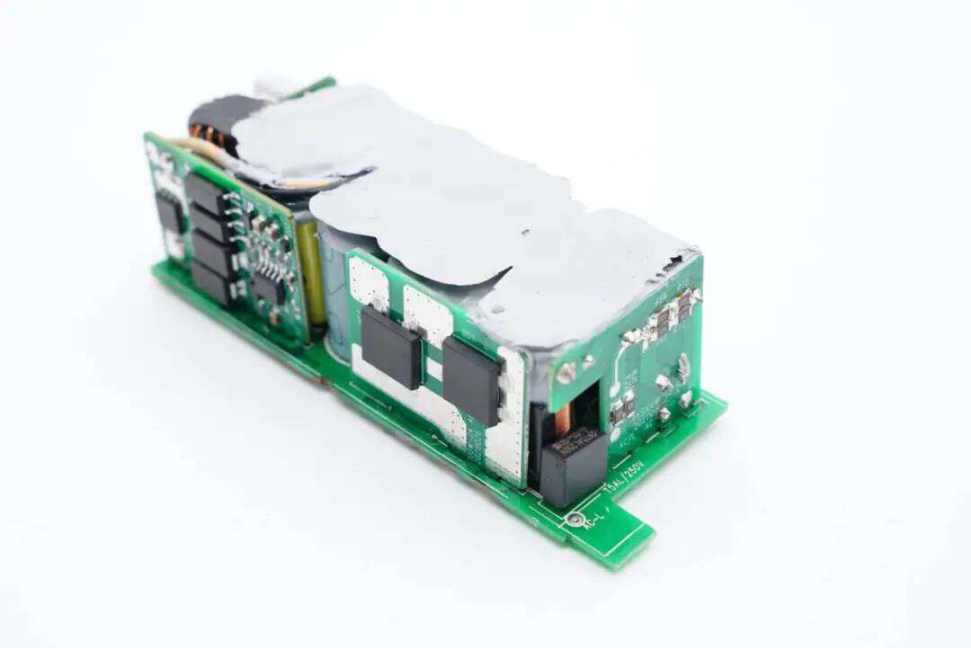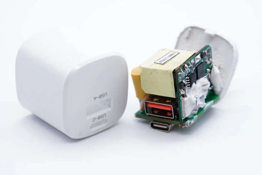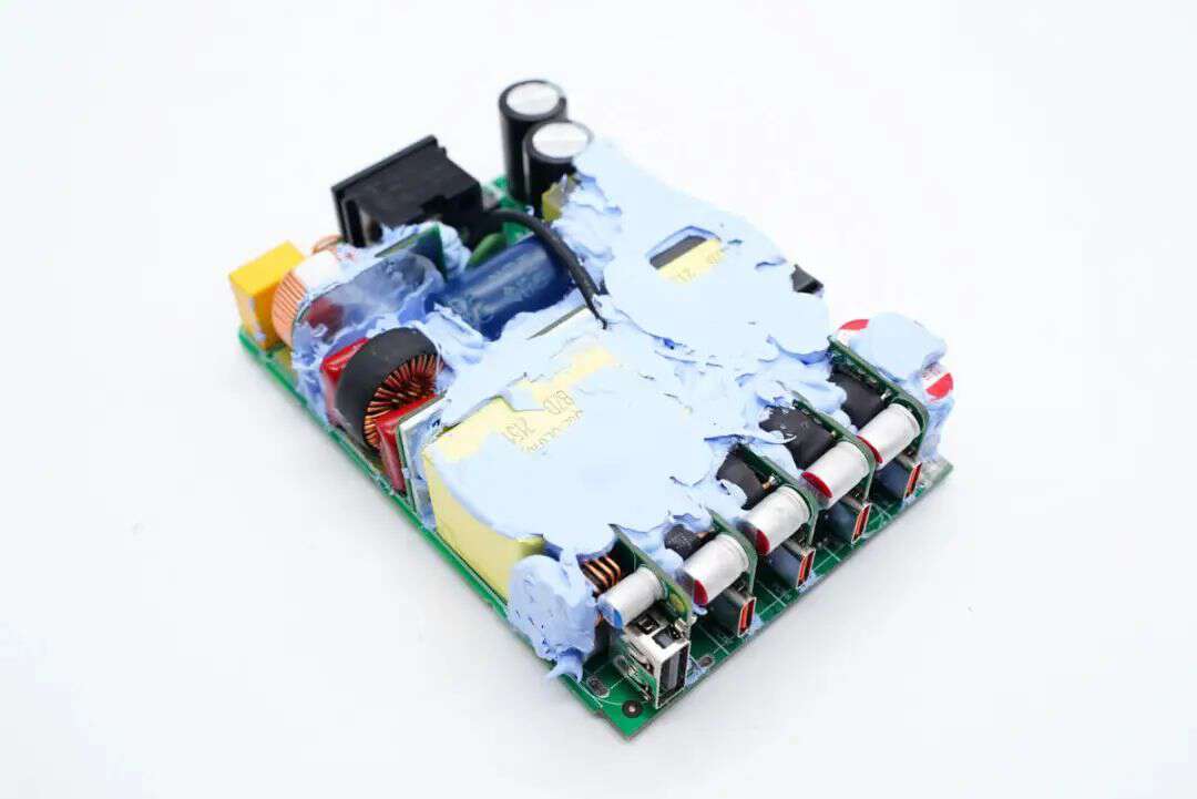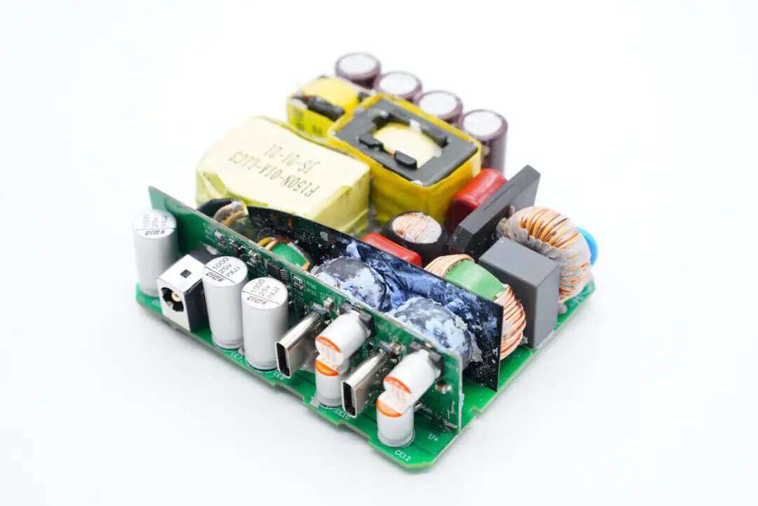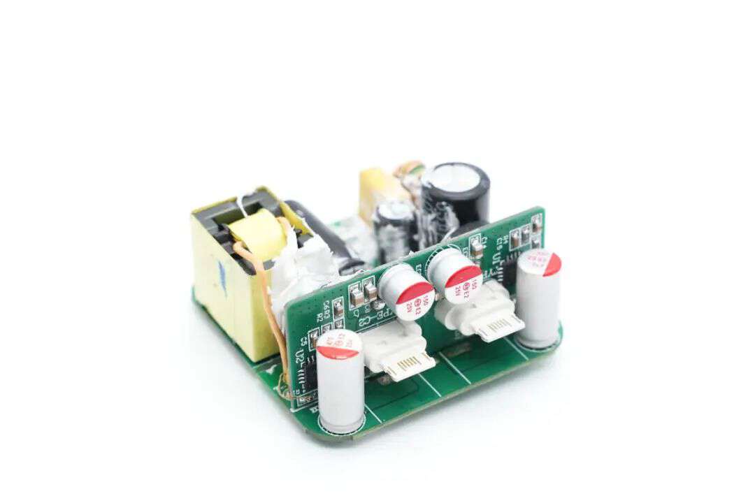 倍思插座内部快充模块采用灌胶工艺,能够增强散热性能,提升耐候性的同时提升保护性能,有效避免插线板在使用过程中中不慎跌落损坏,更加经久耐用。插座内部使用特锐祥TMY1102M和快充模块使用恩智浦TEA2016AAT+TEA1995 PFC+LLC+同步整流方案,恒压输出,由五块小板焊接组成为一个整体。
